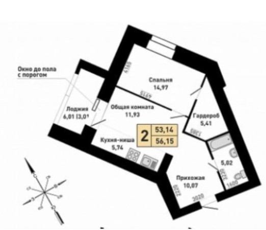 Общая площадь 56 м2