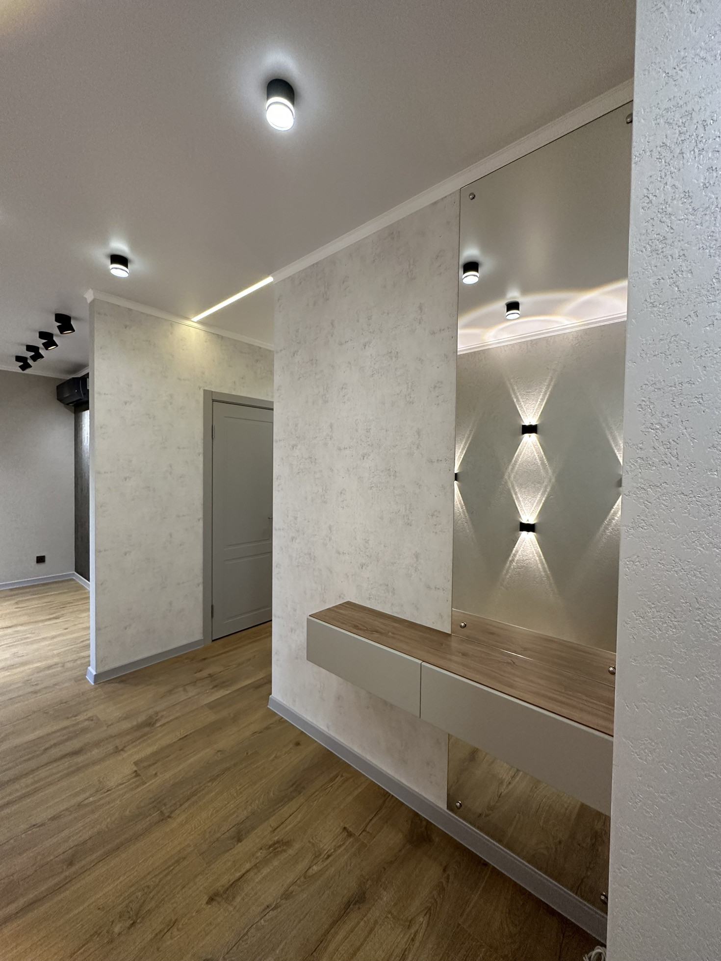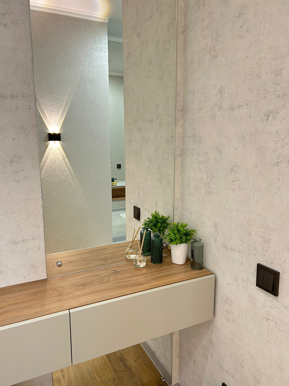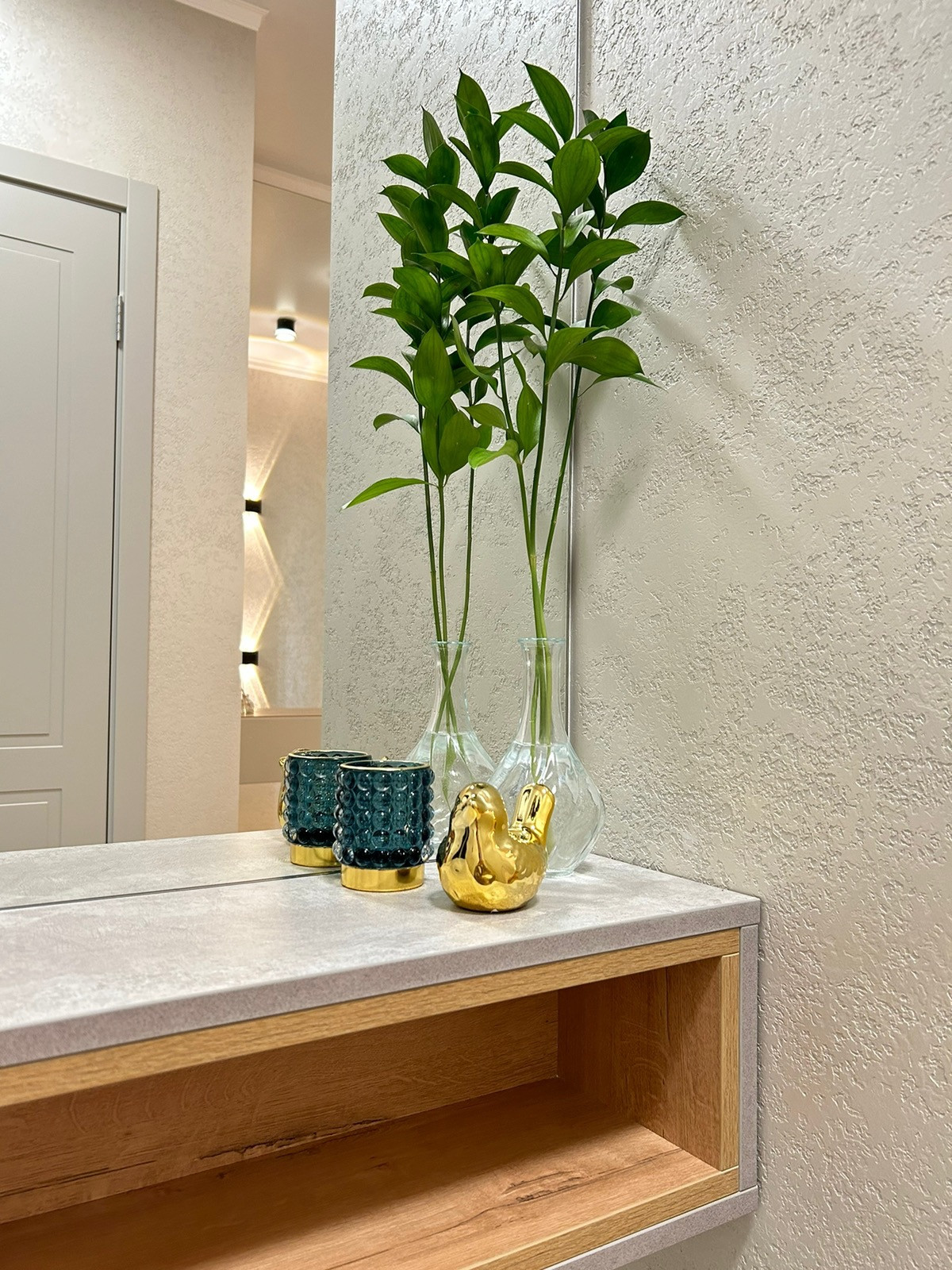 Декоративные зеркала и тумбы в прихожей, и спальне.