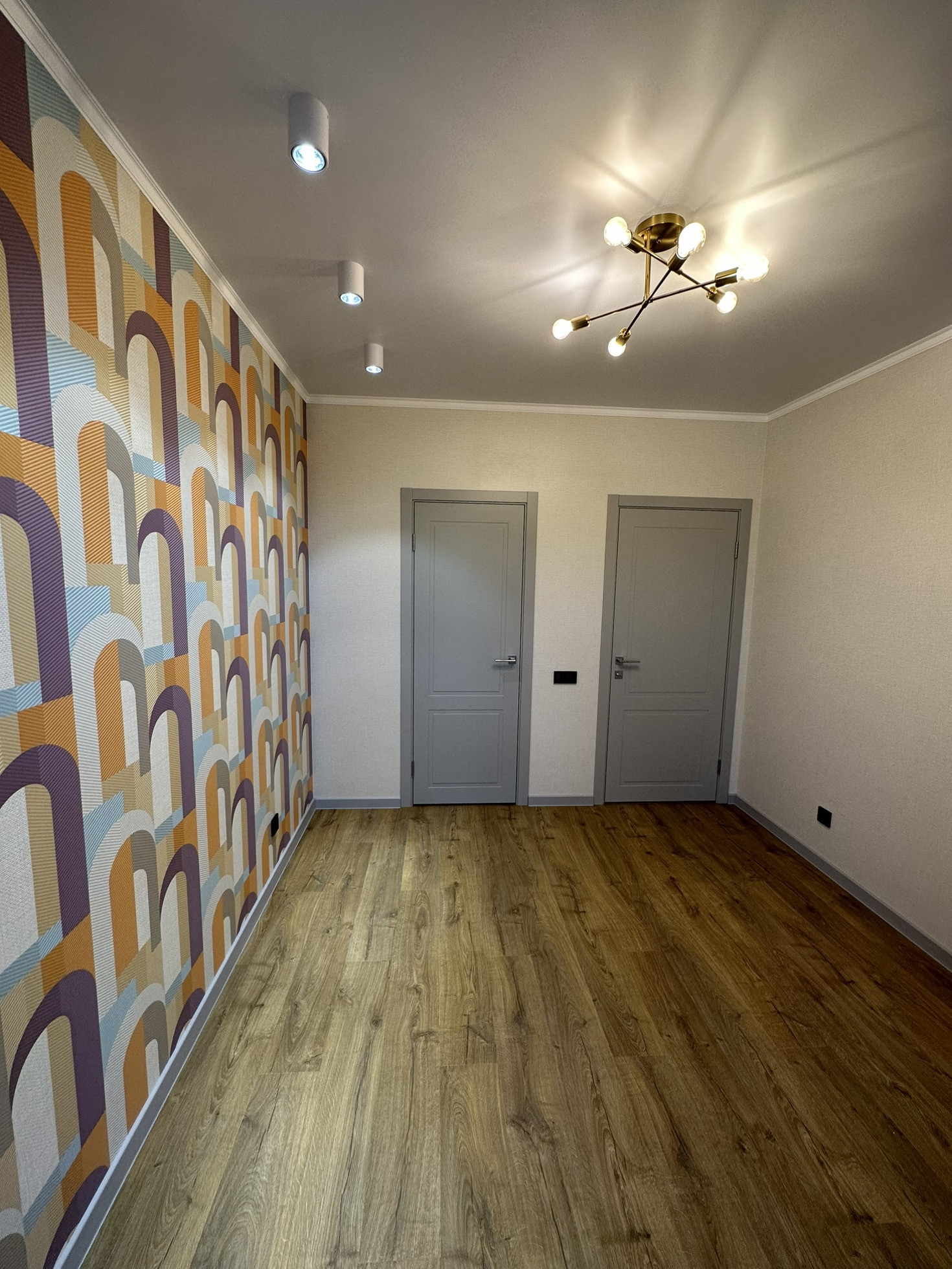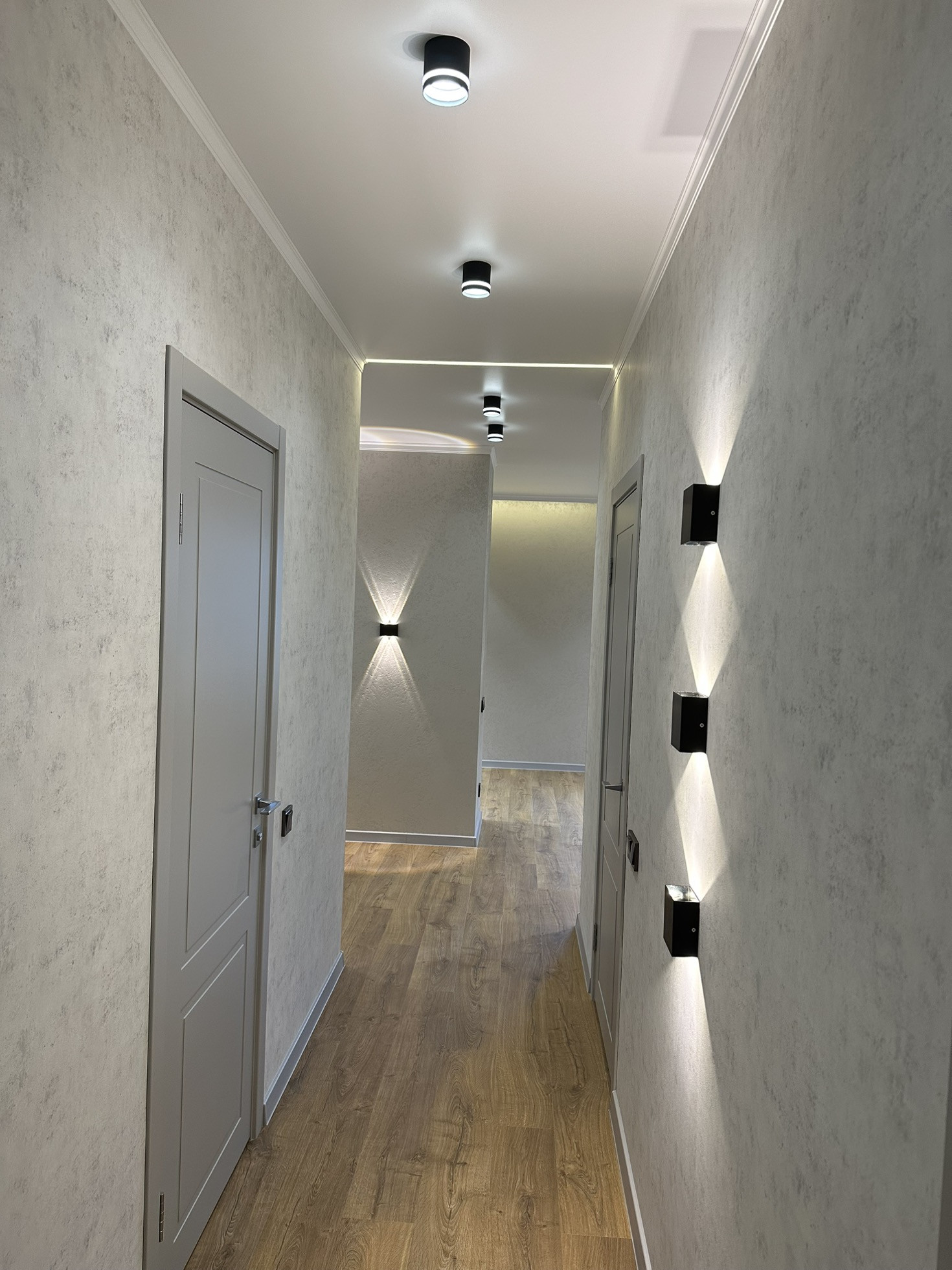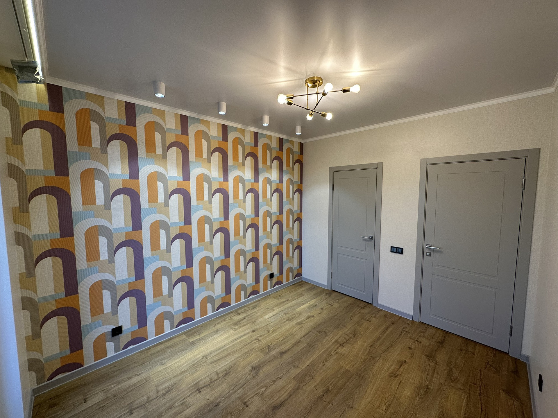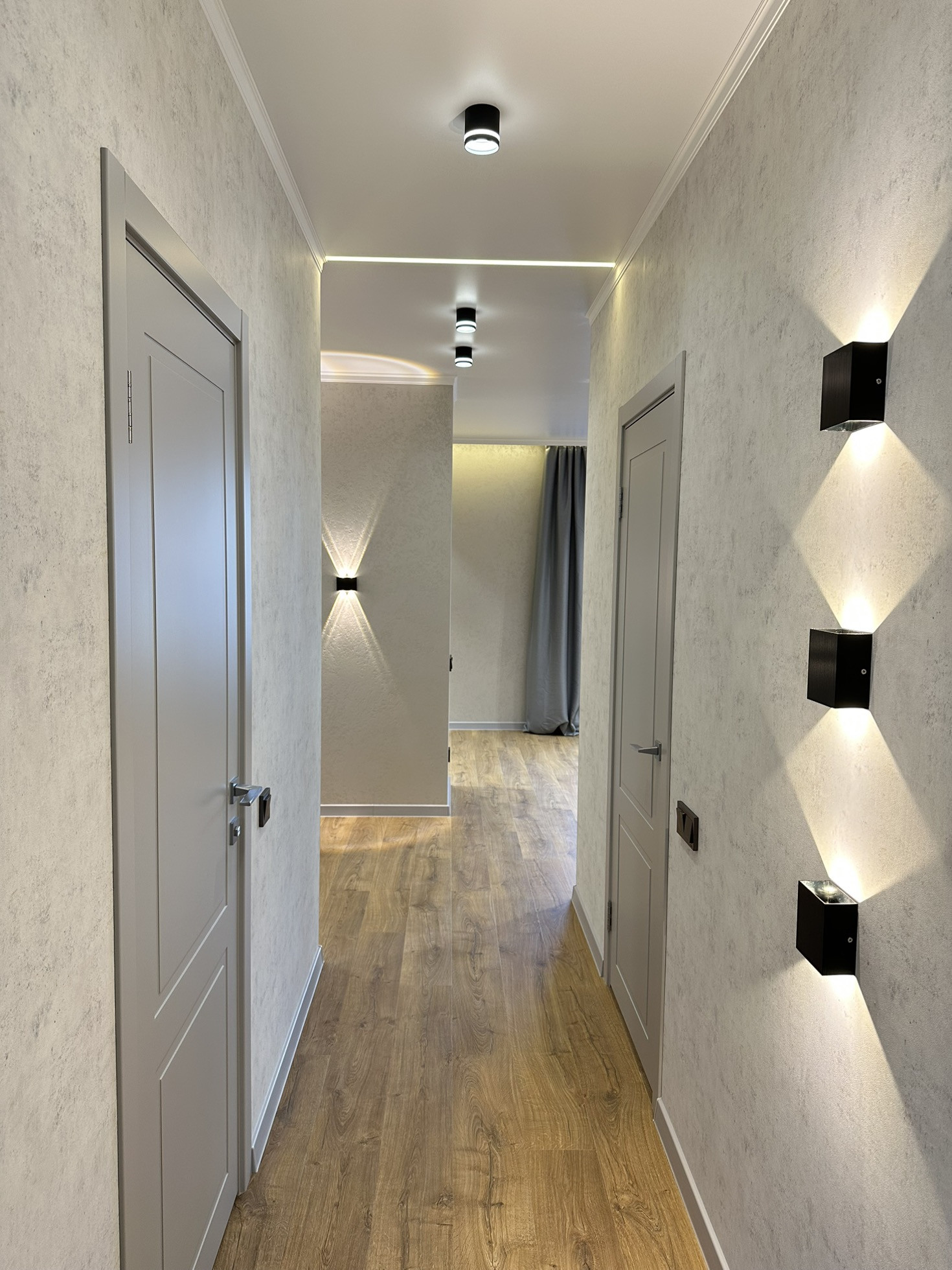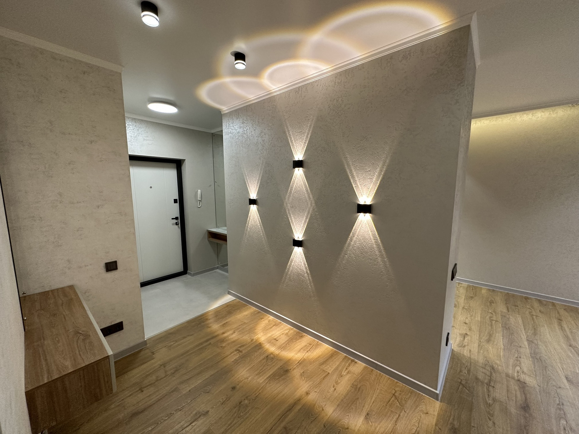 Качественная входная дверь, стильные межкомнатные двери (эмаль), многофункциональное освещение по всей квартире, различные бра, светодиодные подсветки в нишах, точечный и основной свет, стильные люстры и плафоны.