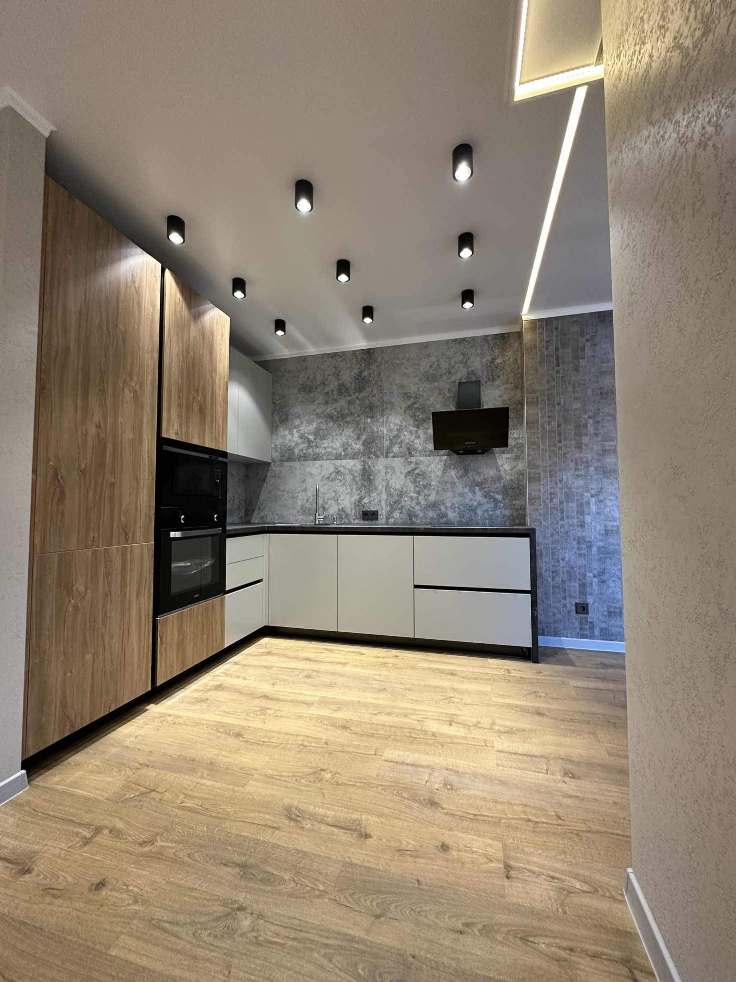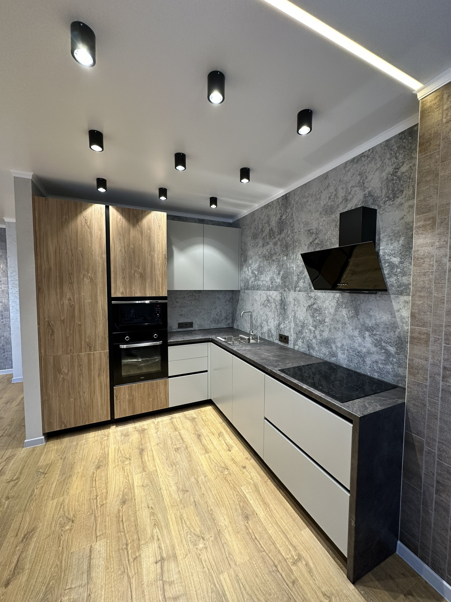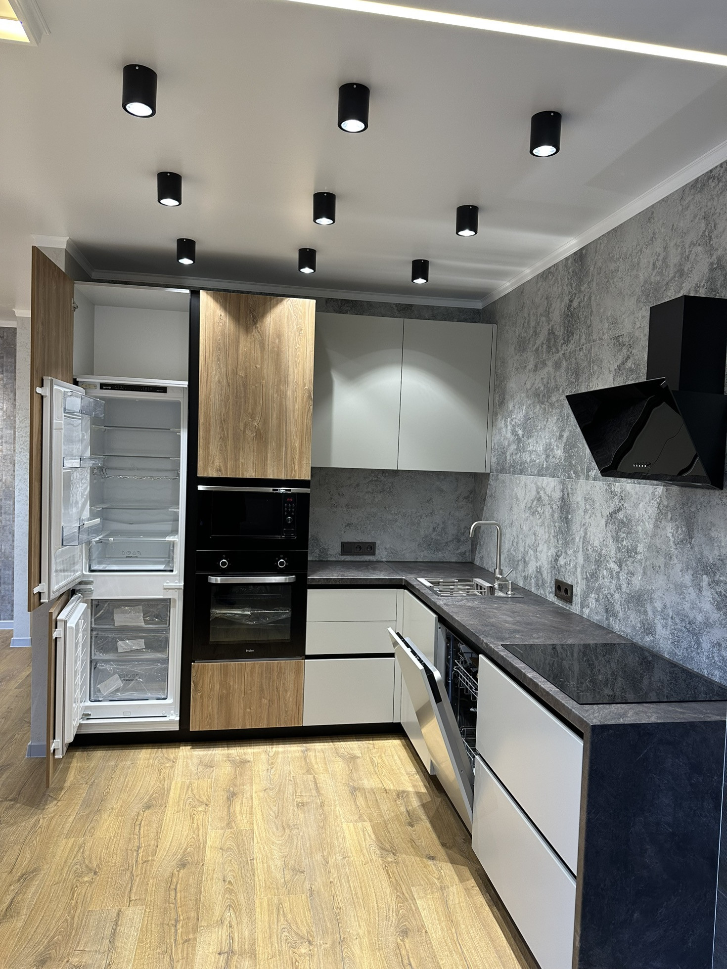 Современная кухня, крашенные фасады (эмаль), фурнитура и выдвижные ящики Blum, фартук из крупноформатного керамогранита, посудомойка с автооткрыванием, вся необходимая встраиваемая техника лучших брендов!