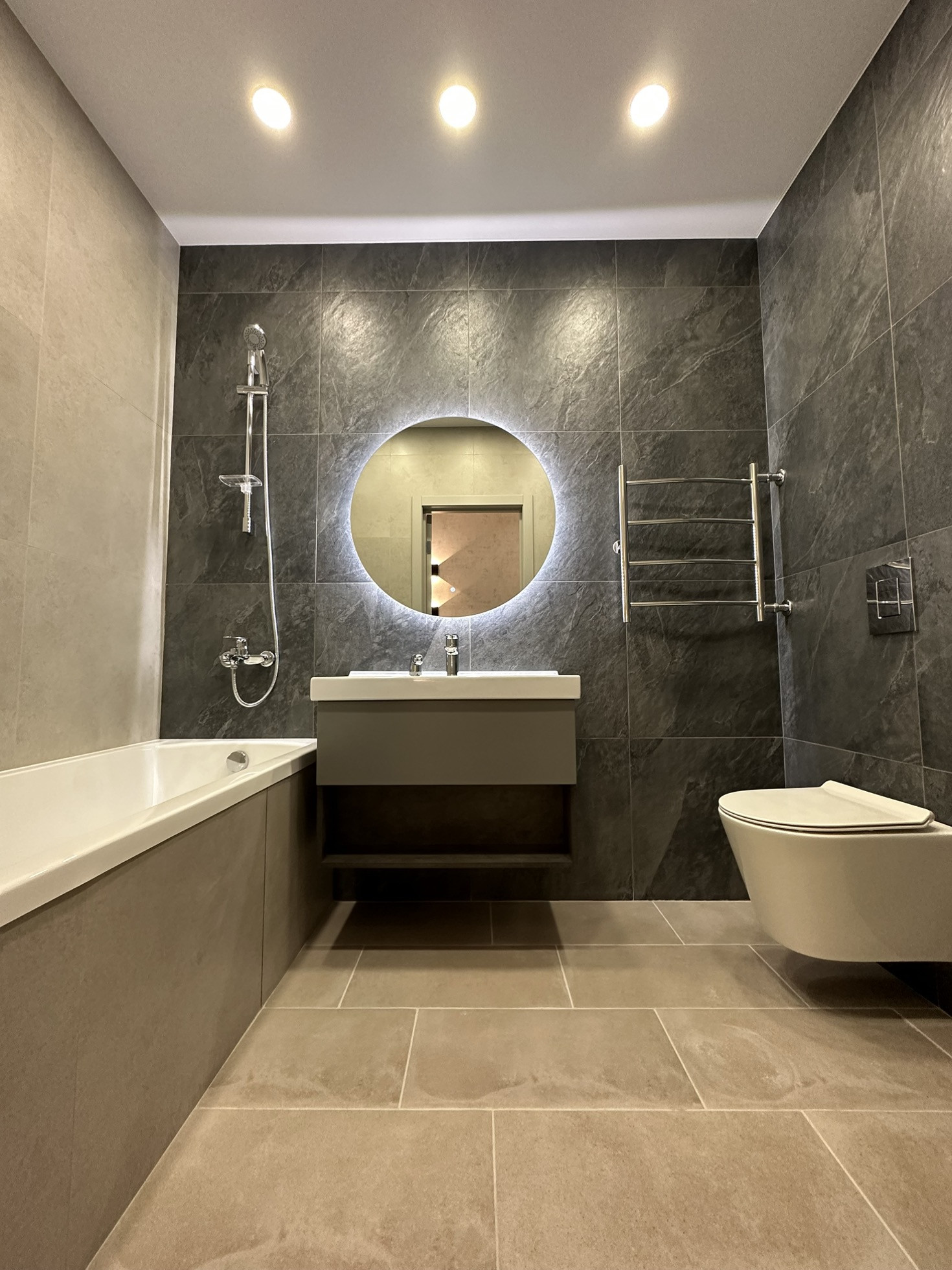 В прихожей и во всех санузлах тёплый пол с датчиками регулирования, в одном санузле туалет и ванная, в другом туалет и душевая, на стенах и на полу керамогранит, дорогая сантехника, инсталляции Grohe