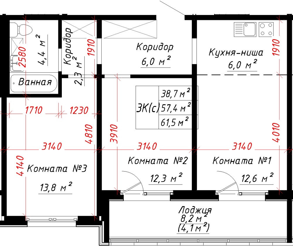 Общая площадь 61.5 м2