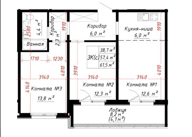 Общая площадь 61.5 м2