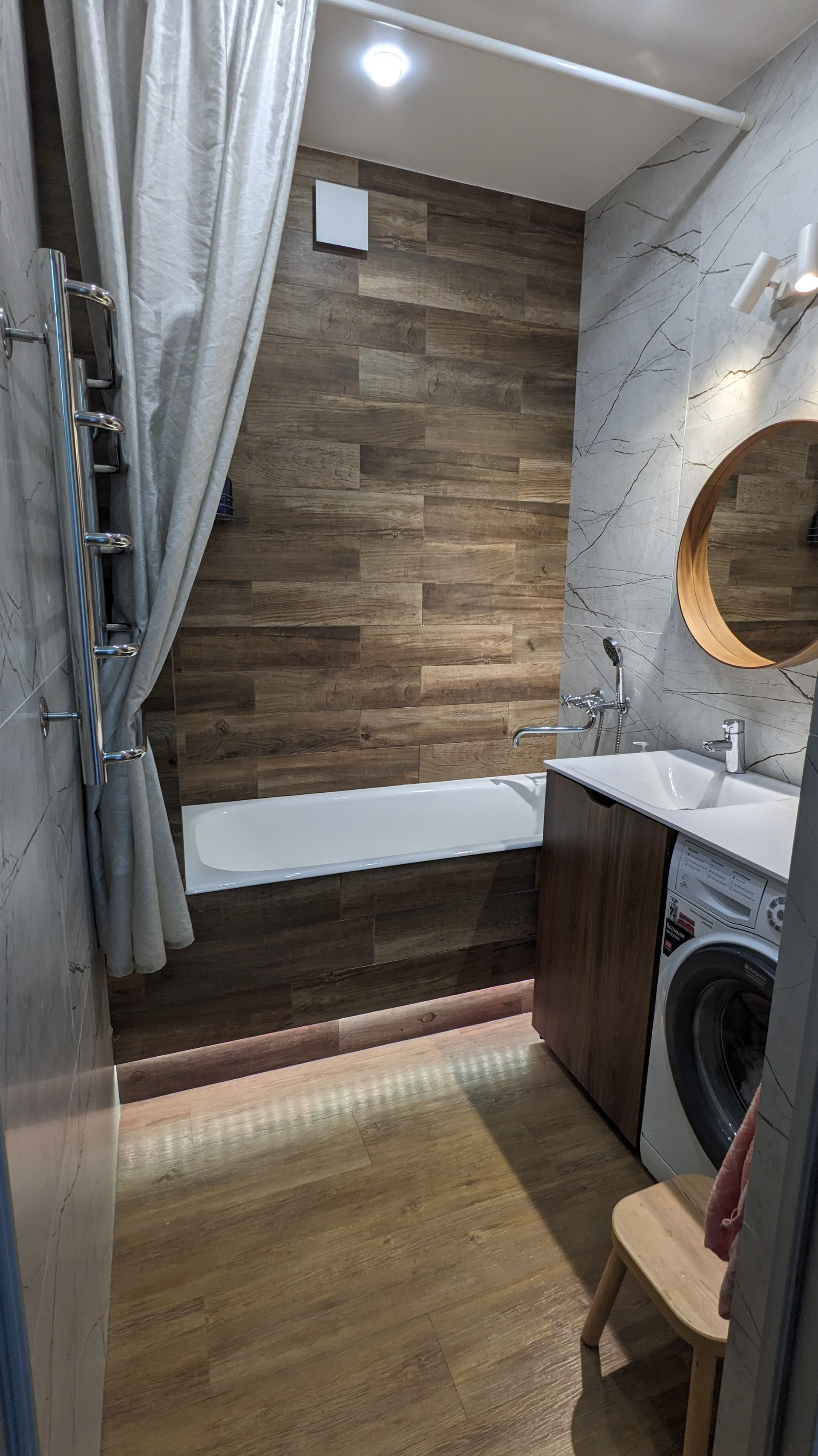 Раздельный санузел, керамогранит, чугунная ванна.