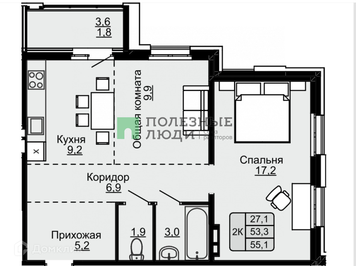 Общая площадь 55.1 м2