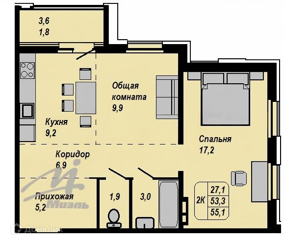 Общая площадь 55.1 м2