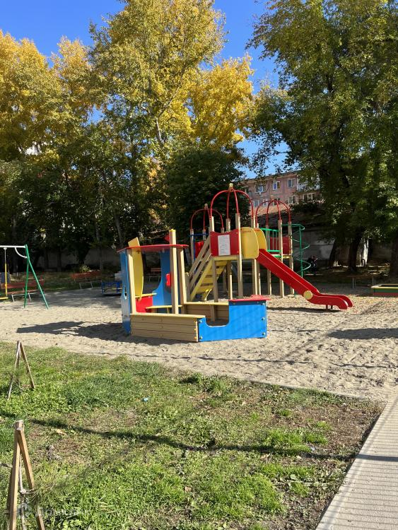 Ухоженный двор, огороженная детская площадка.