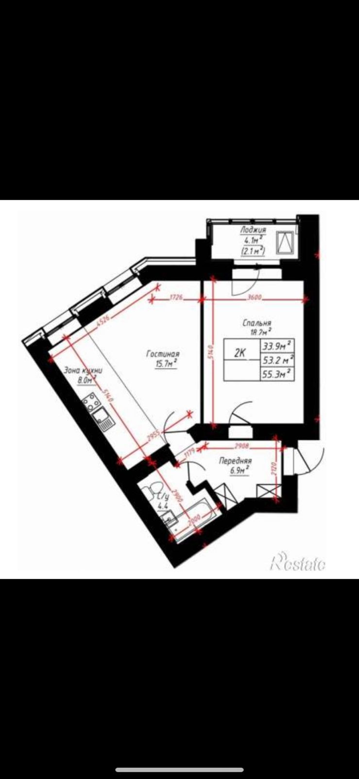 Общая площадь 53.2 м2