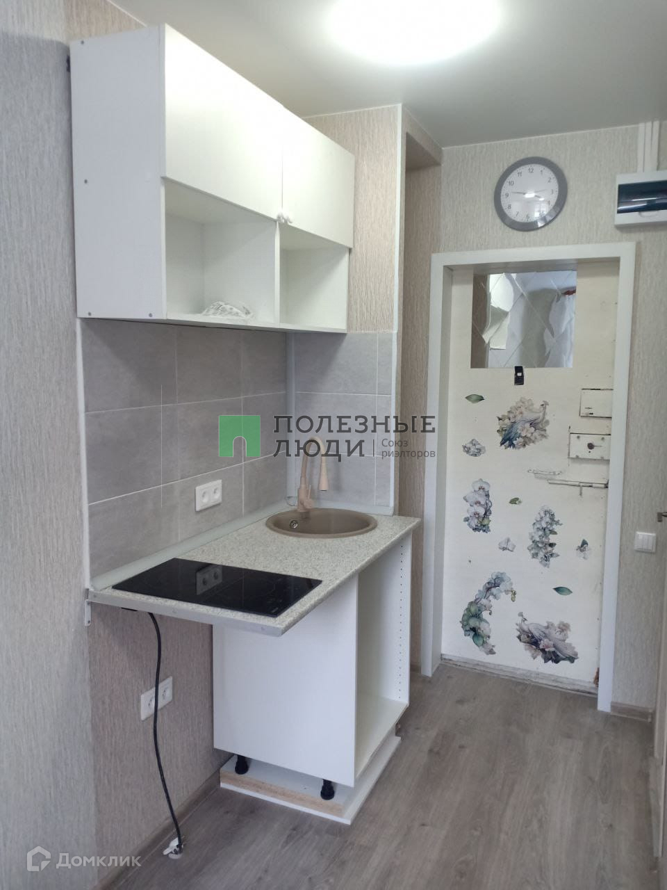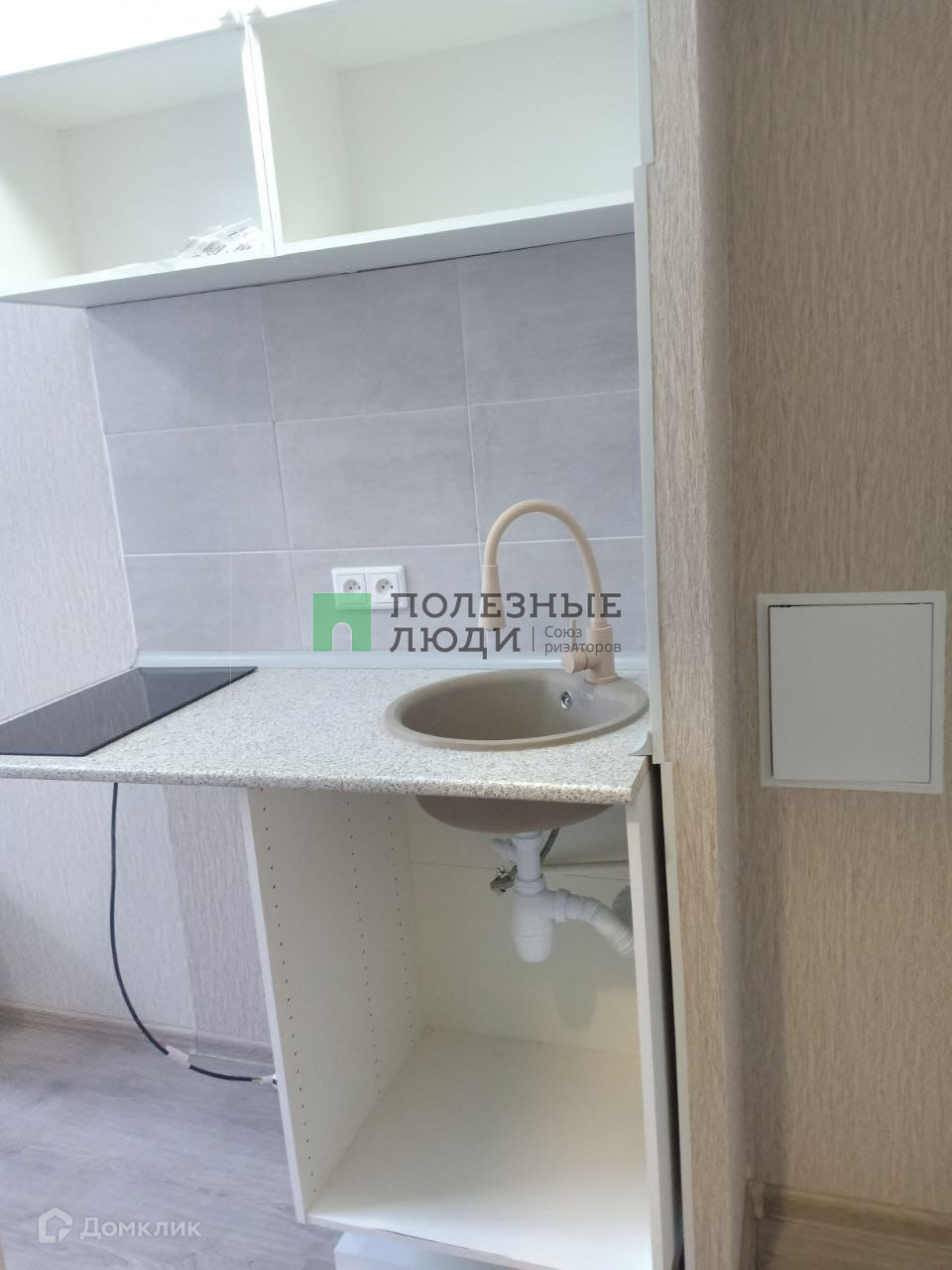 В комнате встроенная кухня, раковина с водой