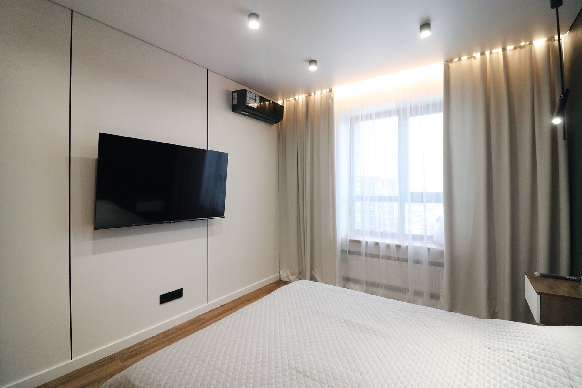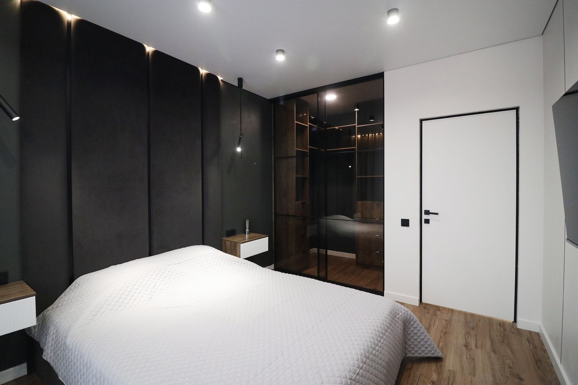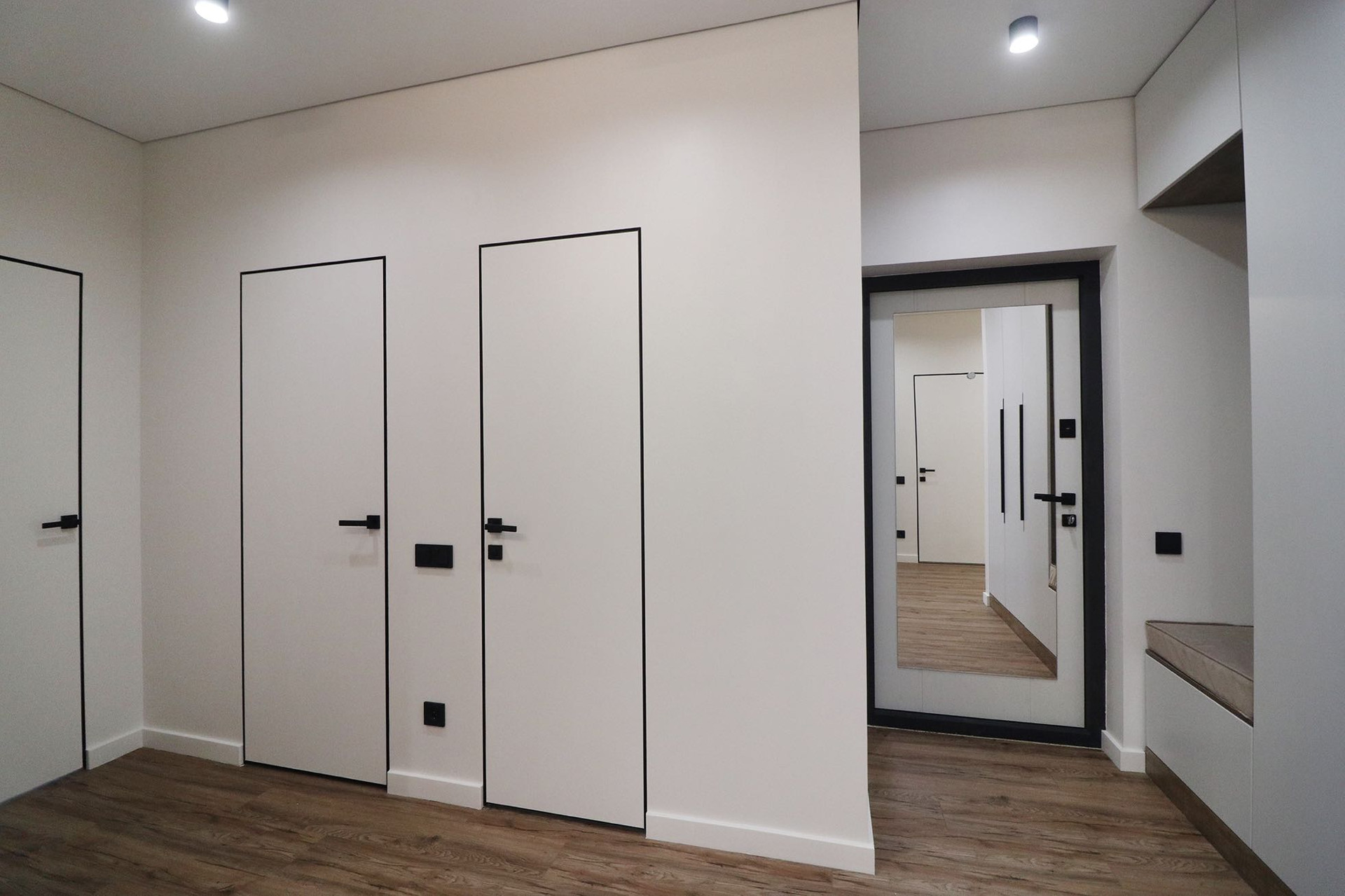 Гипсовый и натяжной потолок, теневой профиль, магнитные треки, кассетные светильники которые можно двигать и доставать, светильники, настенные бра, очень много встроенных подсветок по всему периметру квартиры