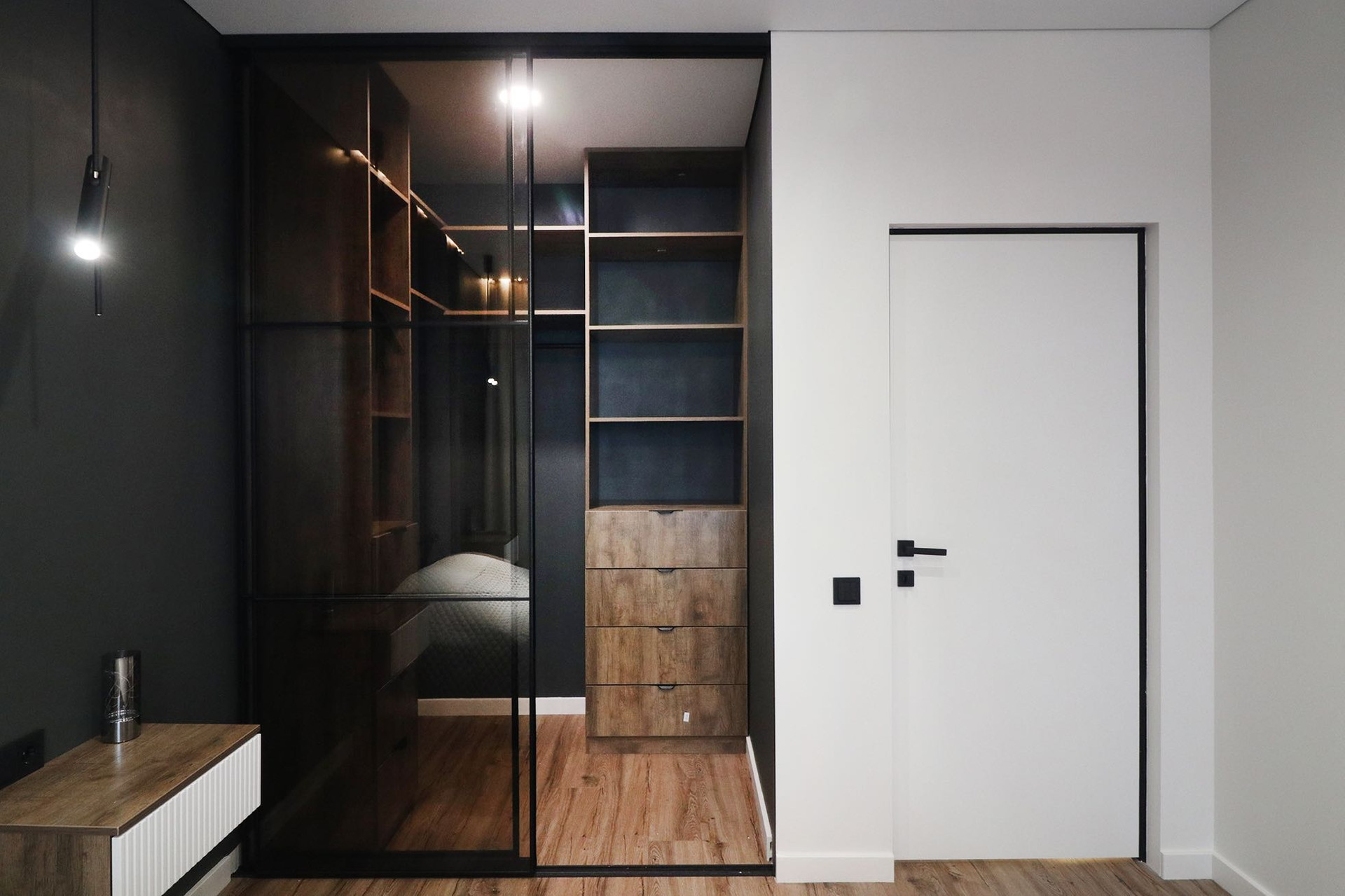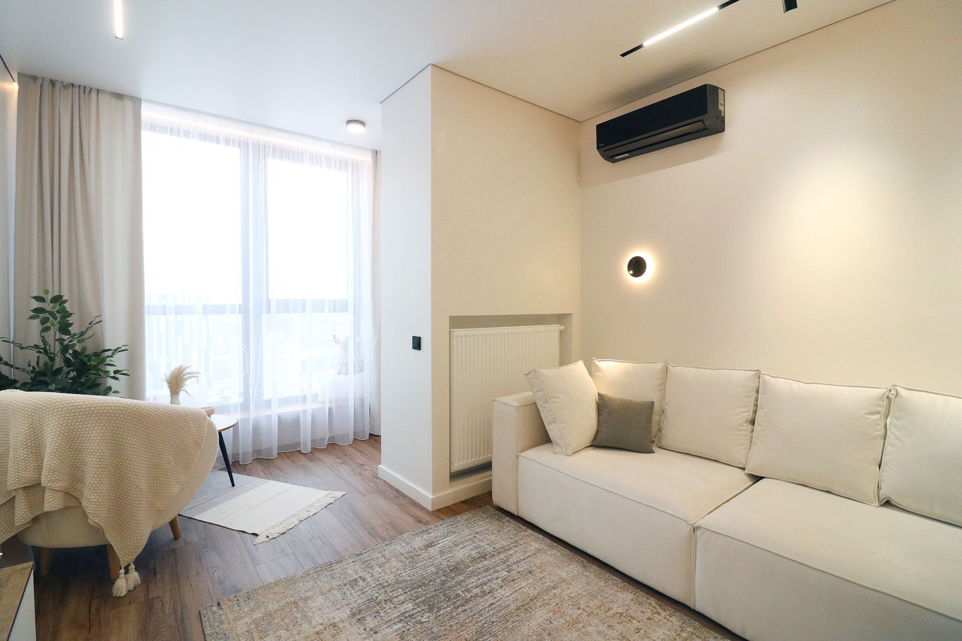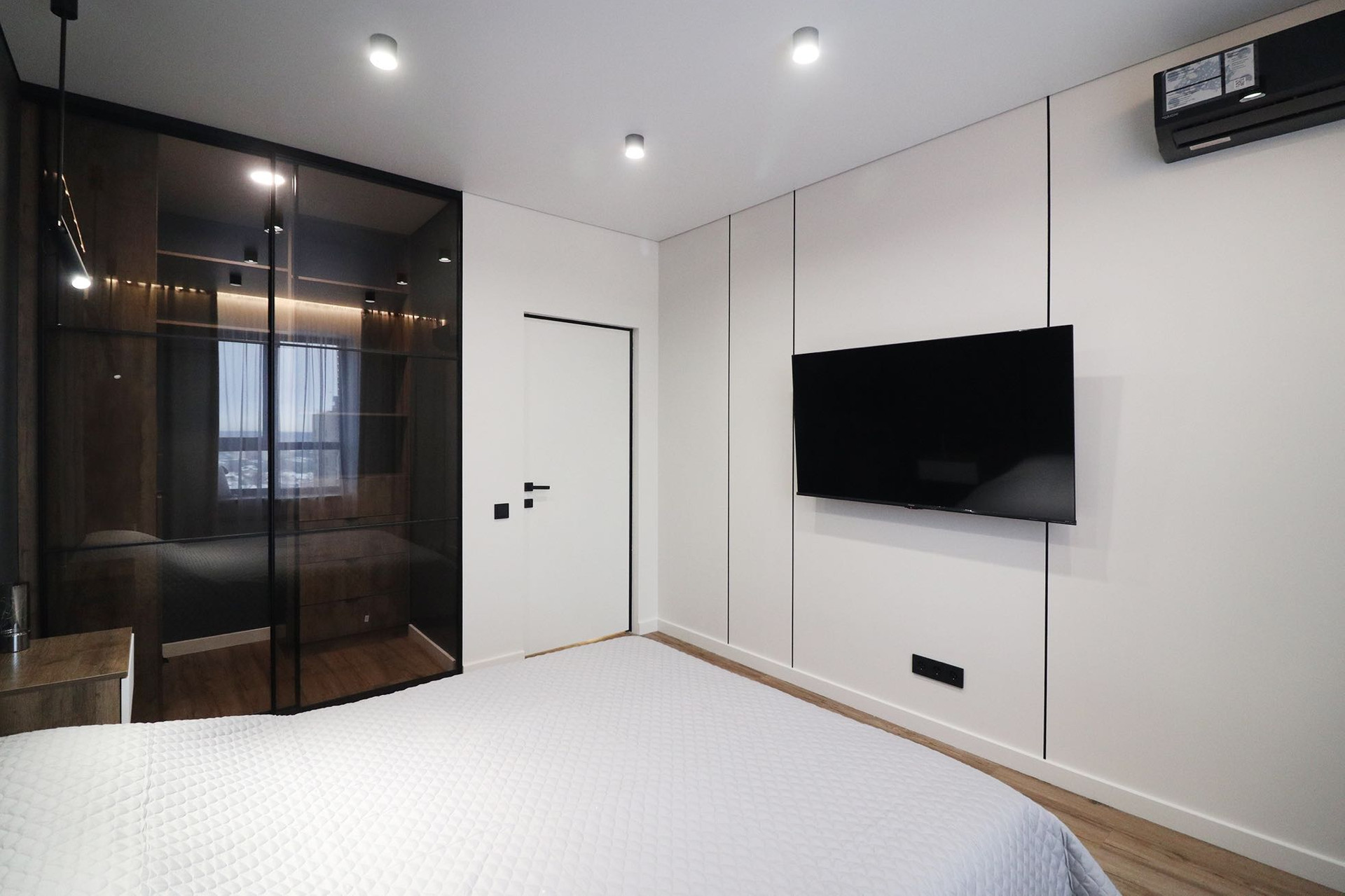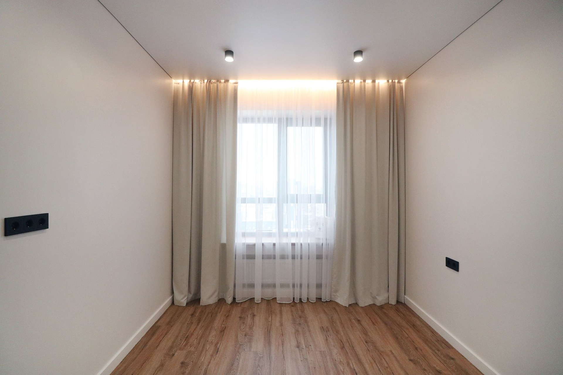 Гипсовый и натяжной потолок, теневой профиль, магнитные треки, кассетные светильники которые можно двигать и доставать, светильники, настенные бра, очень много встроенных подсветок по всему периметру квартиры