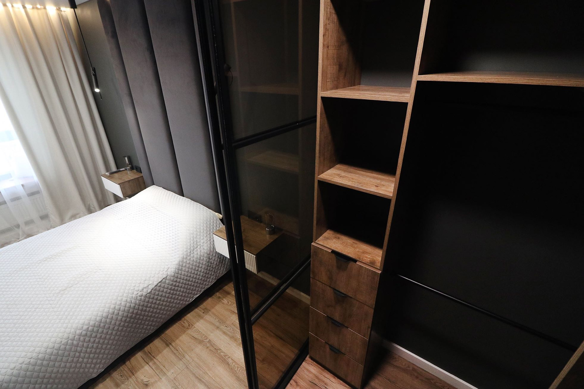 В спальне кровать с мягким изголовьем до потолка, подъемным механизмом и ортопедическим матрасом
