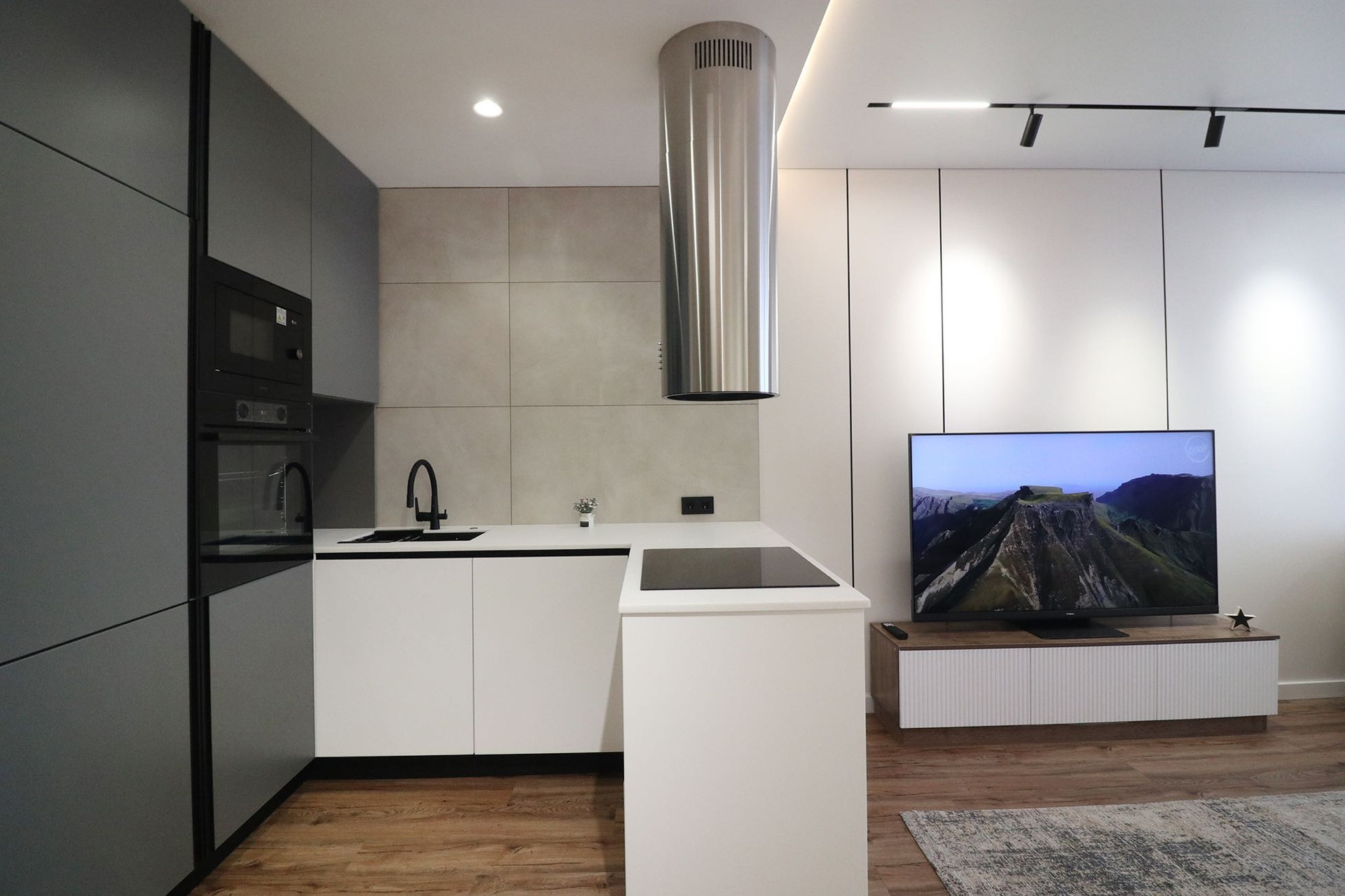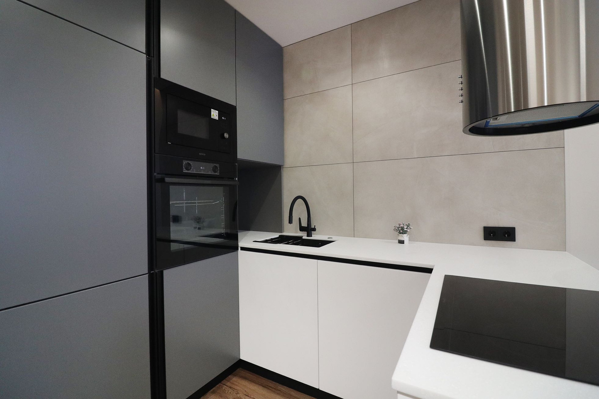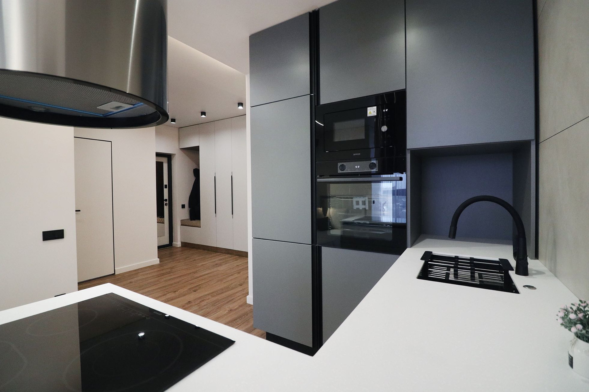 Кухня: крашенные фасады, каменная столешница, вся техника встроенная ( холодиник, варочная панель, микроволновка, духовой шкаф) островная вытяжка, фильтр трехмерной очистки воды!