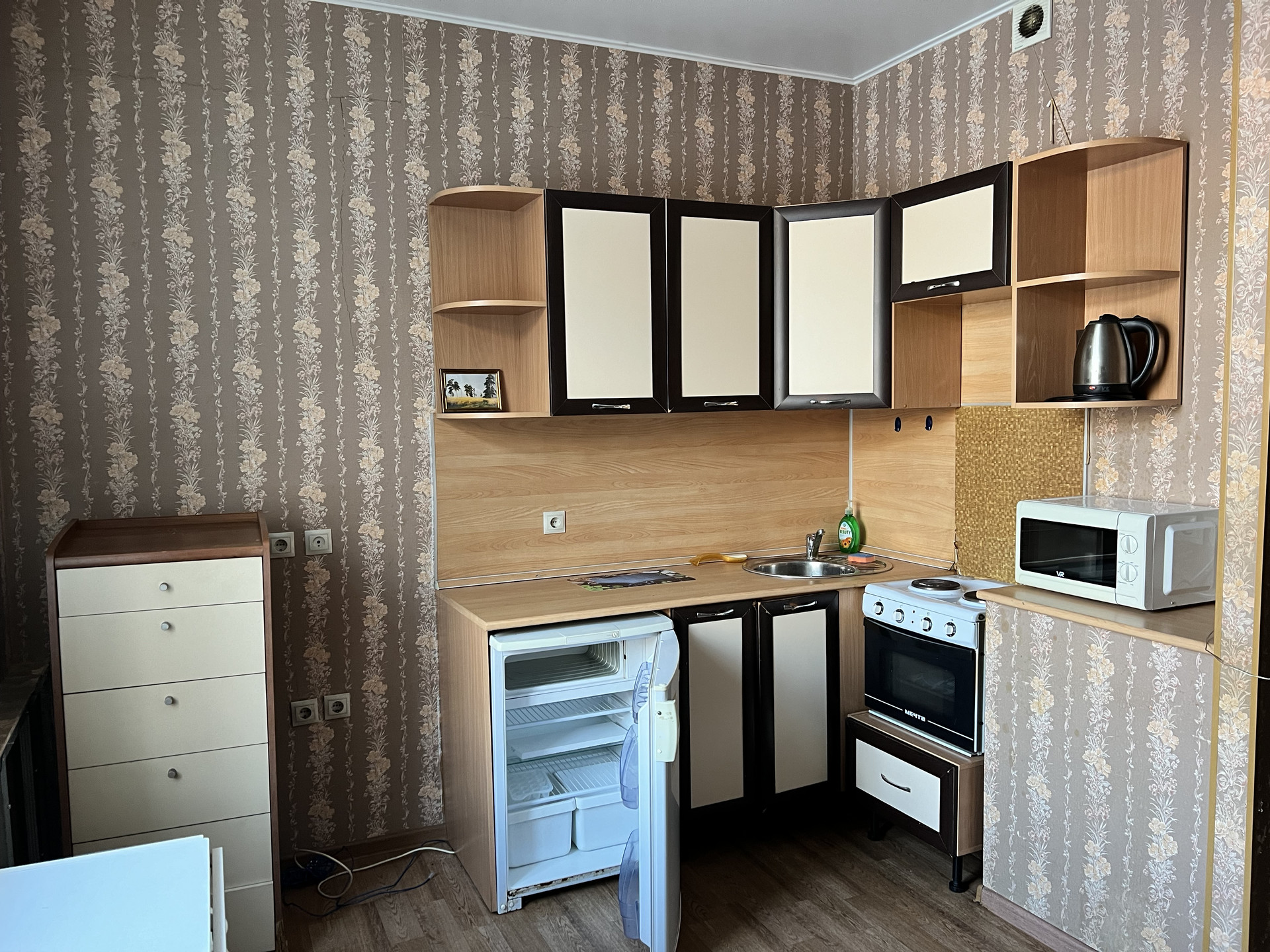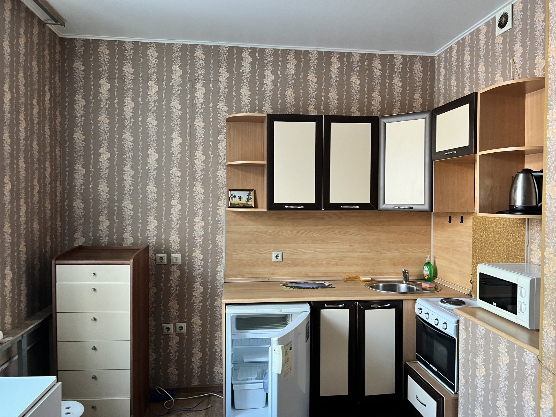 Центр города!! Район площади Октября. Квартира студия 18,5 кв метра. Встроенный кухонный гарнитур, холодильник, эл плита, шкаф, водонагреватель остается в квартире.
