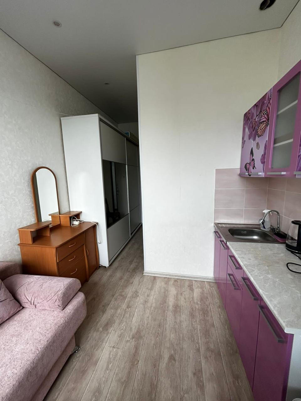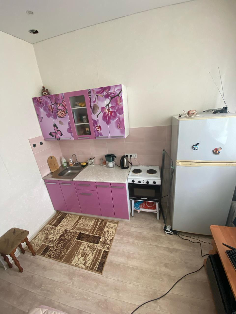 Продаётся студия (апартаменты), 15,5 кв.м., тёплая, не торцевая, в хорошем состоянии. Напольное покрытие линолеум, в ванной комнате кафель. Студия продаётся с мебелью, кухонный гарнитур и шкаф, всё на фото. Дом расположен в тихом месте в стороне от проезжей части. Установлено поэтажное видеонаблюдение, низкие коммунальные платежи. Чистый подъезд.   Район с хорошо развитой инфраструктурой, в шаговой доступности находится всё необходимое для комфортного проживания: детский сад, школа, магазины, аптеки, хорошая транспортная развязка. Подходит под все виды расчётов. Чистая продажа, без долгов и обременений.