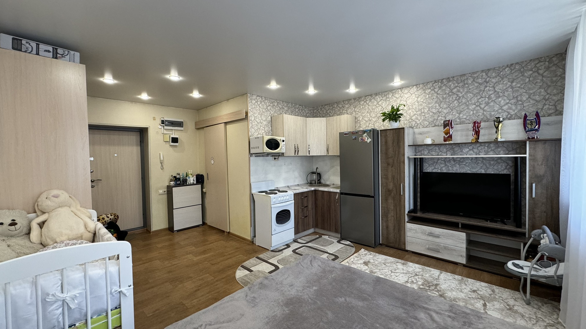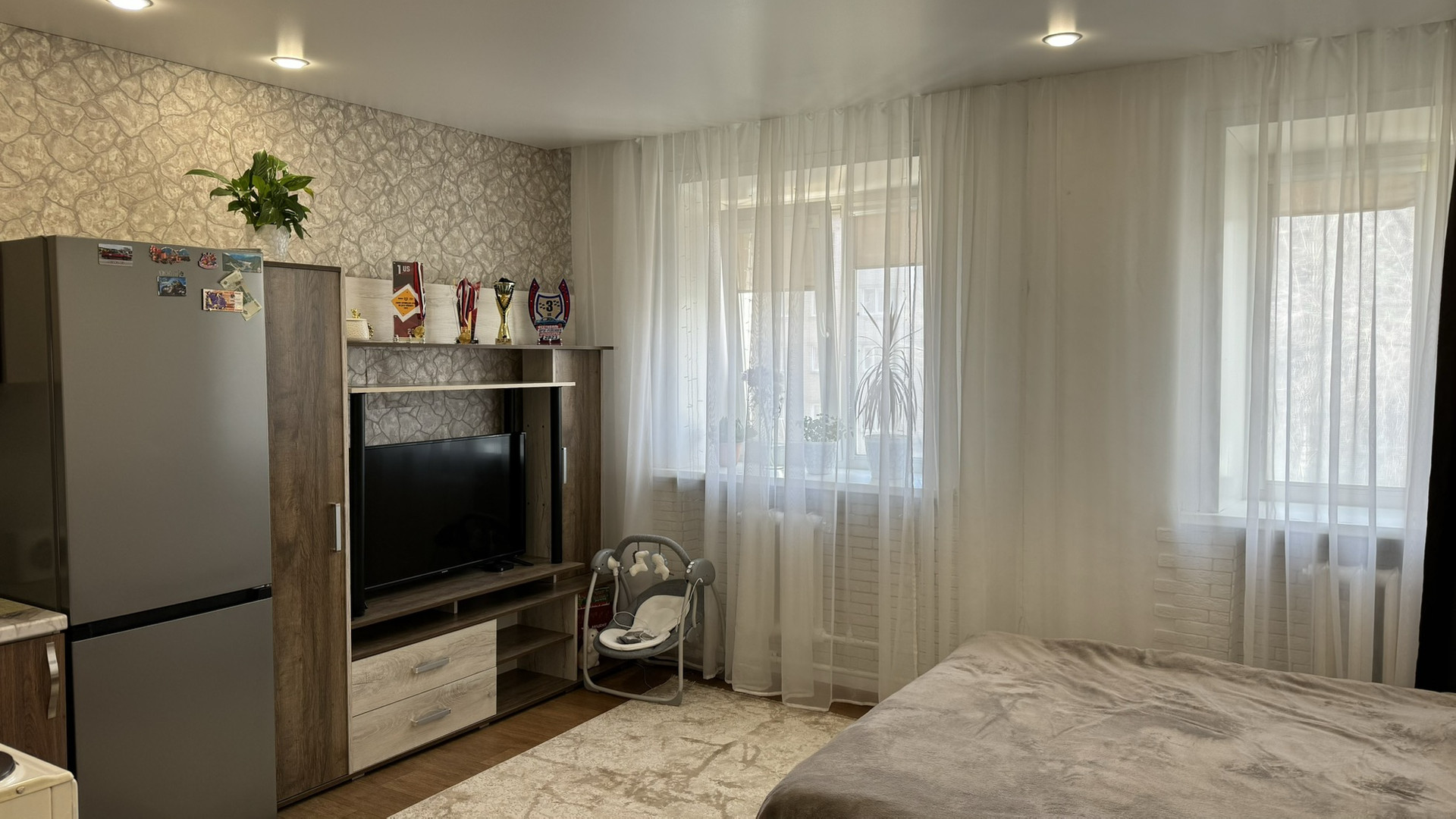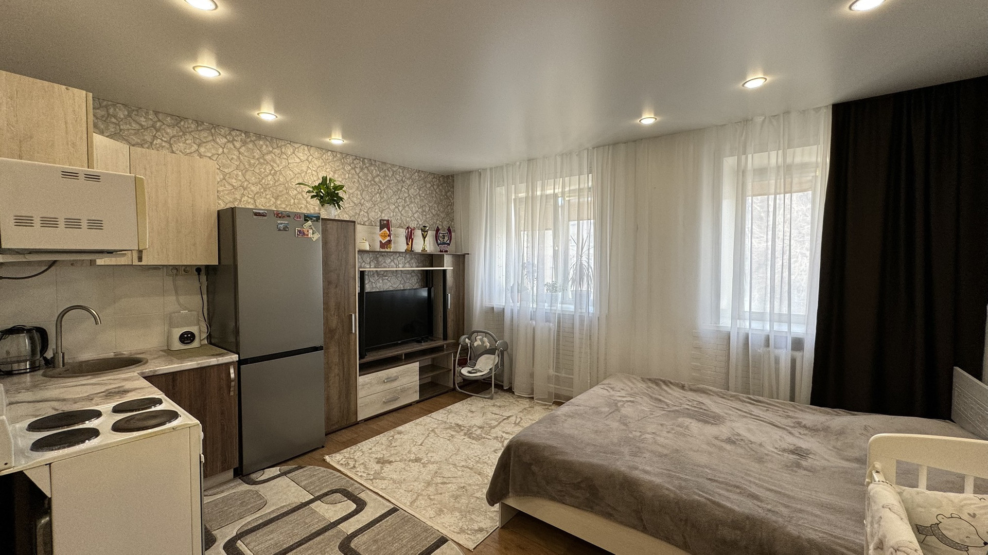 Квартира-студия в хорошем состоянии. Натяжные потолки, на полу линолеум, совмещенный санузел в кафеле, окна пластиковые, хорошая входная дверь. Не торцевая, находится в середине дома. Средний этаж. В квартире очень тепло, восточная сторона.