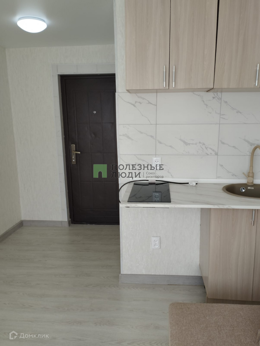 Есть зона кухни, где встроенная мебель, кухонный фартук из кафеля, вода горячая и холодная, варочная панель новая, есть место для стиральной машинки с выводами под воду и слива,