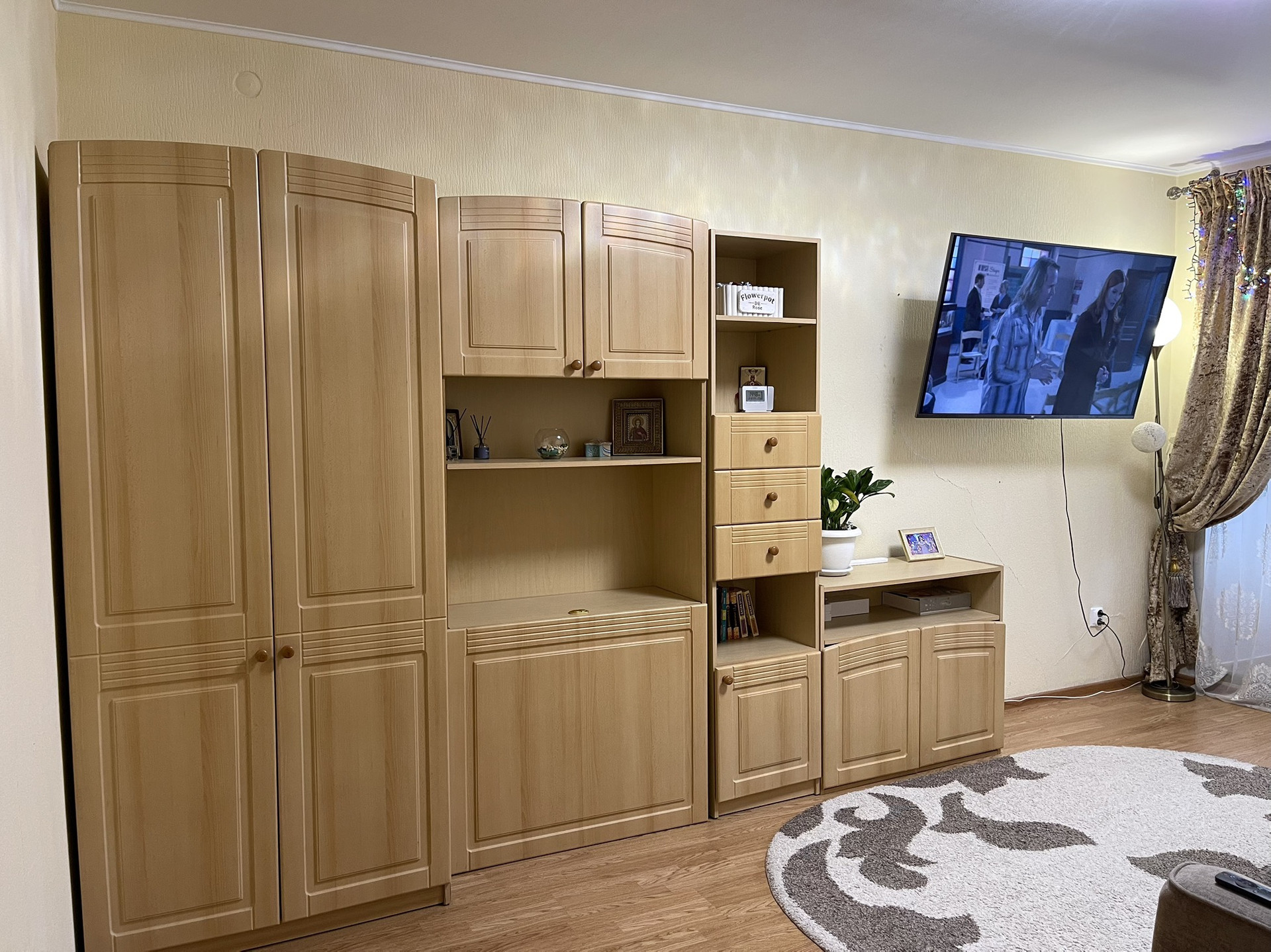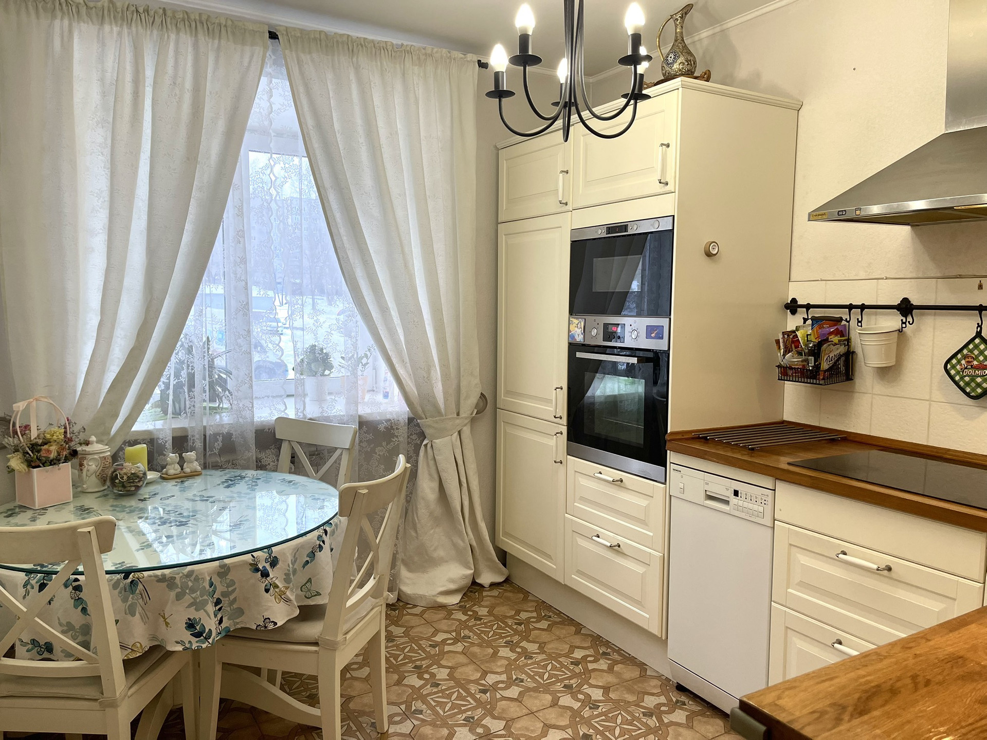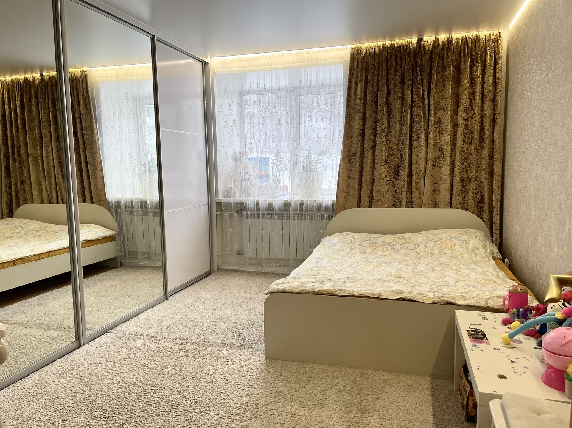 Квартира имеет классическую планировку, особенностью является вместительная квадратная кухня. В одной комнате сделан евроремонт с натяжными потолками с подсветкой и встроенным во всю стену шкафом. Квартира полностью меблирована, и укомплектована хорошей техникой, на кухне стоит гарнитур со встроенной бытовой техникой (варочная панель, духовой шкаф, свч-печь, посудомоечная машина). Имеется водонагреватель, стиральная машина. Все в отличном рабочем состоянии. В квартире есть большой застекленный балкон.
