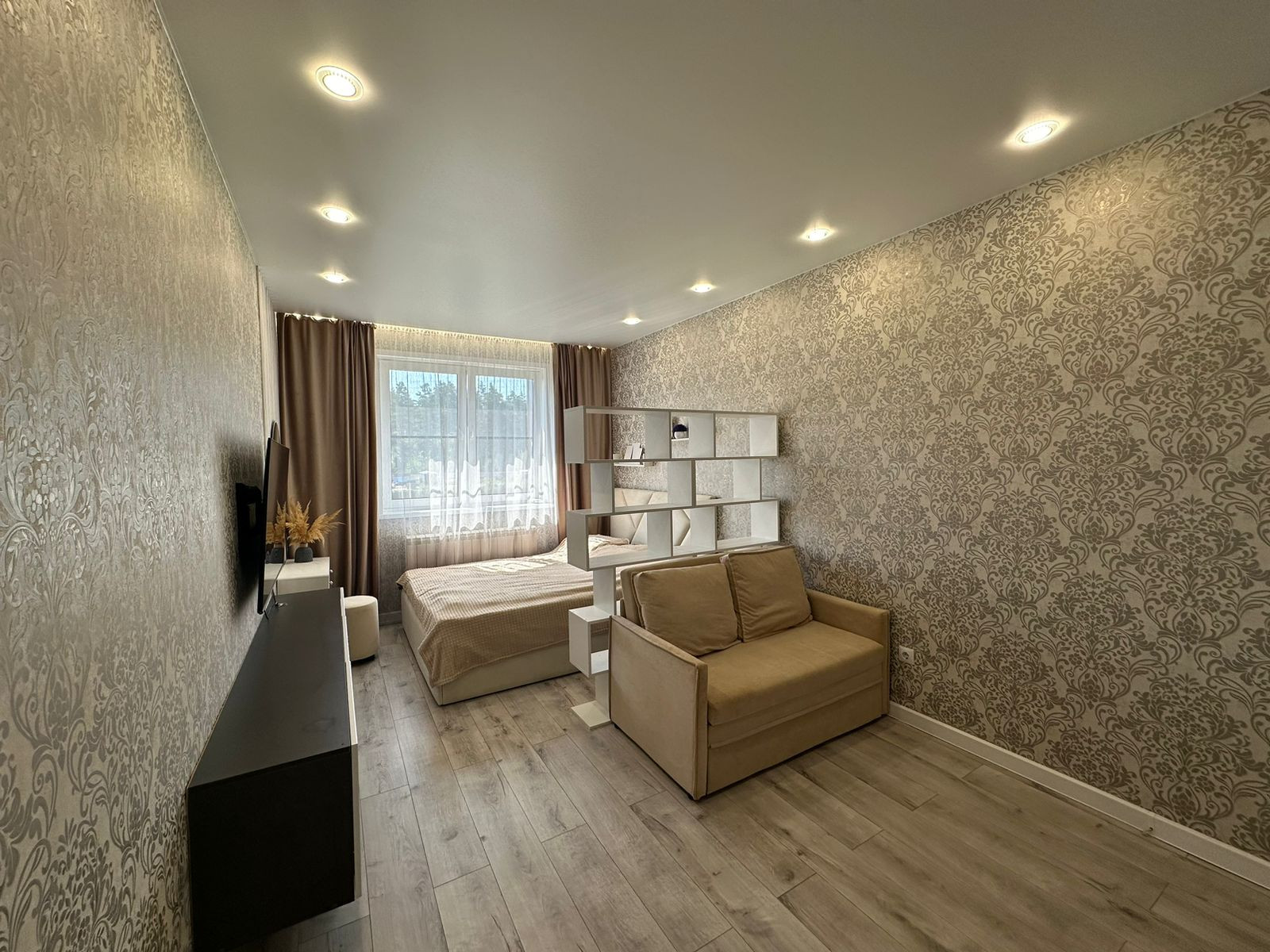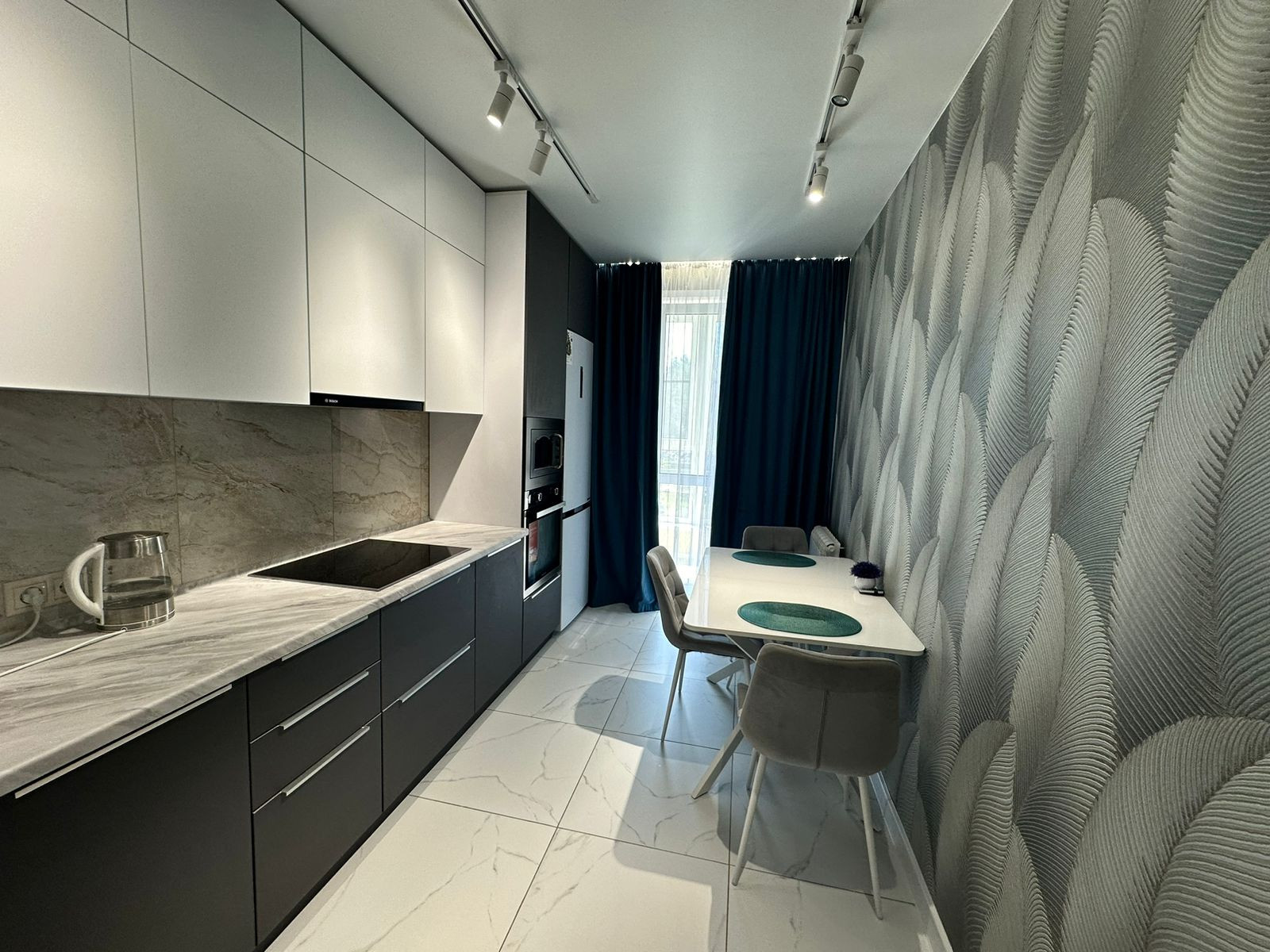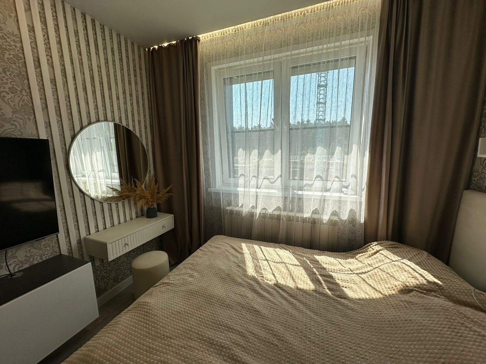 Квартира вся укомплектована мебелью и техникой, обеденный стол из закаленного стекла, стулья, тюль и шторы, кровать, телевизор 55 дюймов, диван!!!