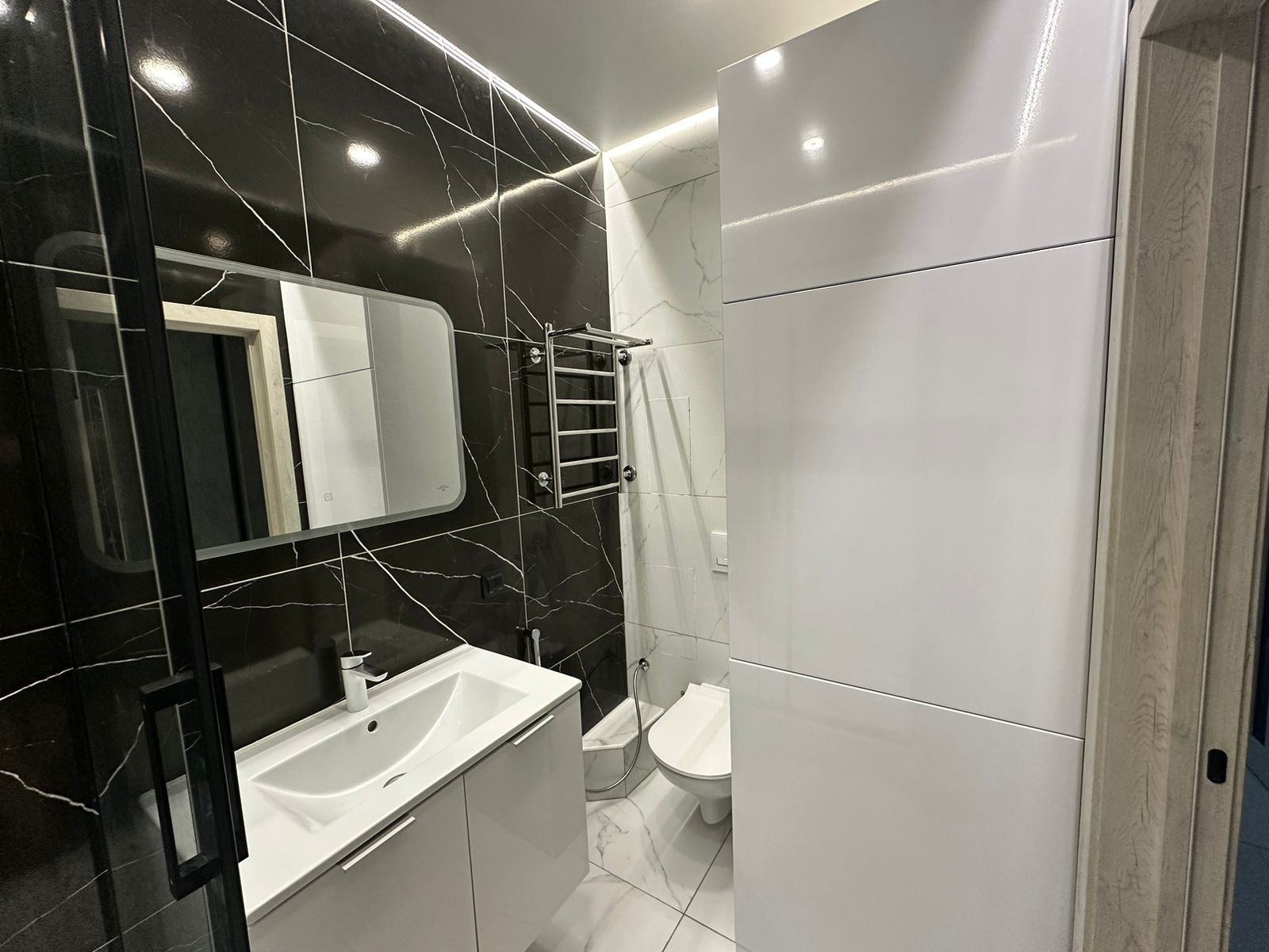 ✅Ванная комната из крупноформатного керамогранита. Стиральная машина Grunding. Душевая кабина.