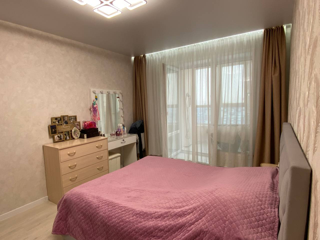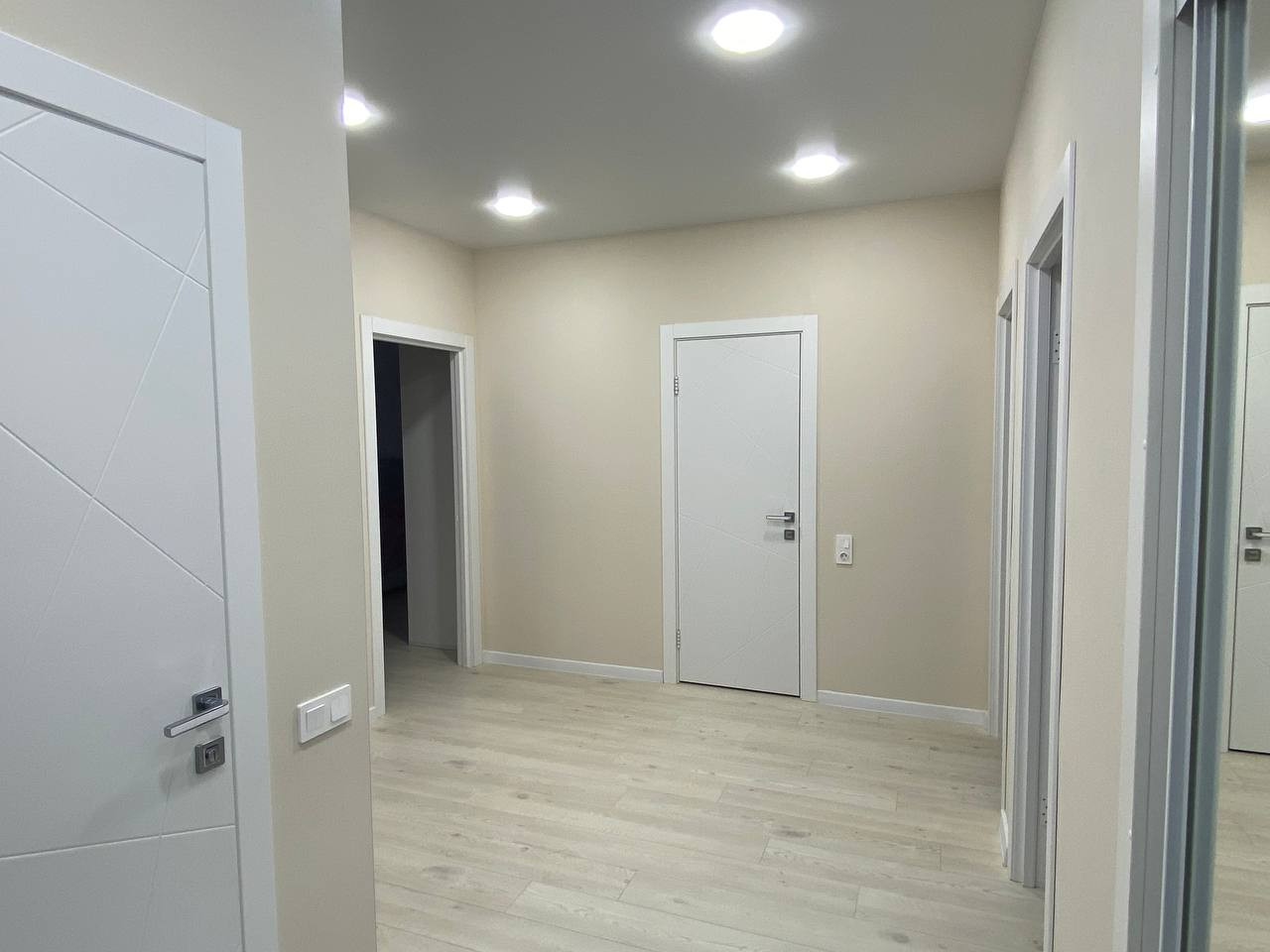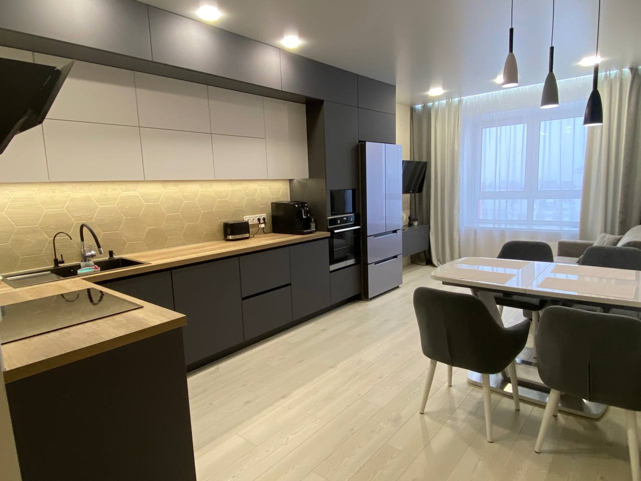 В квартире выполнен дизайнерский ремонт из качественных, дорогих материалов. На полу кварцевый ламинат. Весь пол выведен в один уровень, стены - все выровнены, потолок натянут во всех комнатах включая сан. узлы и гардеробную. Квартира не требует вложений!