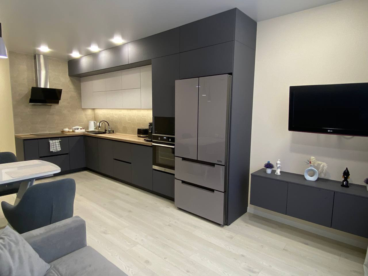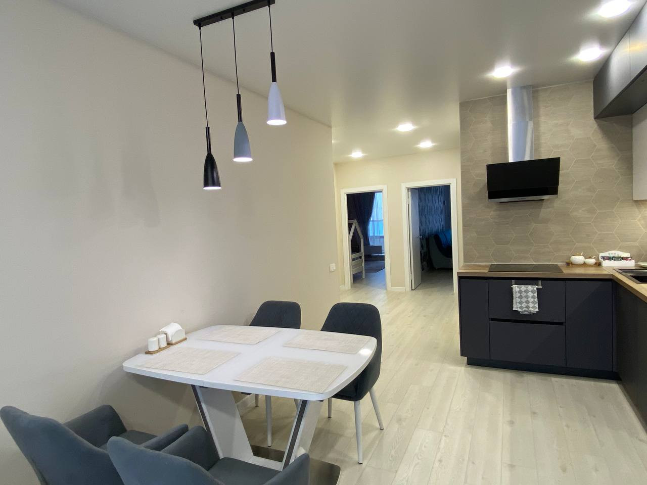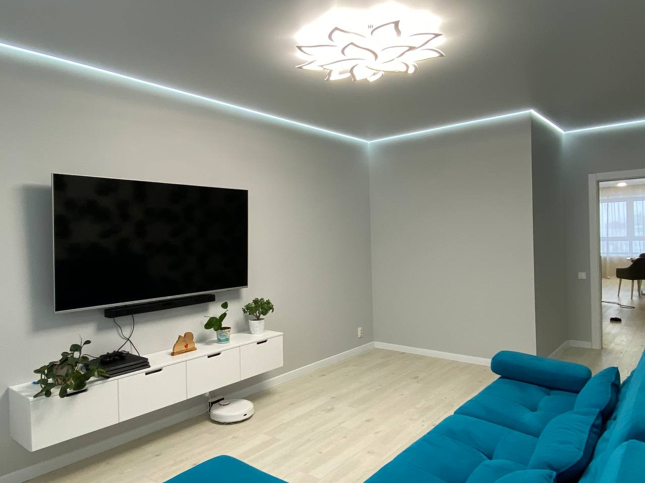 В квартире выполнен дизайнерский ремонт из качественных, дорогих материалов. На полу кварцевый ламинат. Весь пол выведен в один уровень, стены - все выровнены, потолок натянут во всех комнатах включая сан. узлы и гардеробную. Квартира не требует вложений!