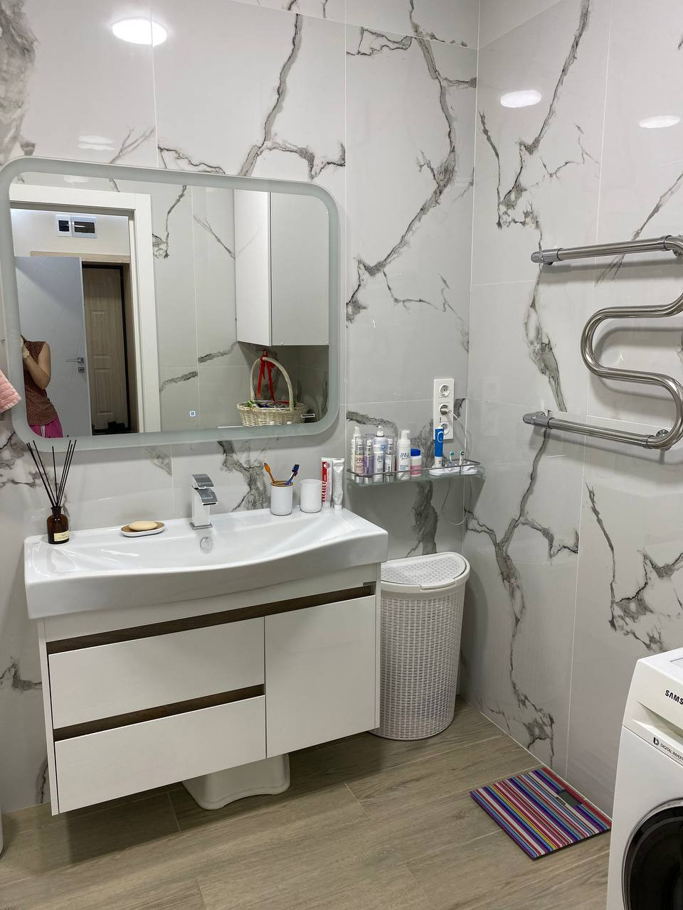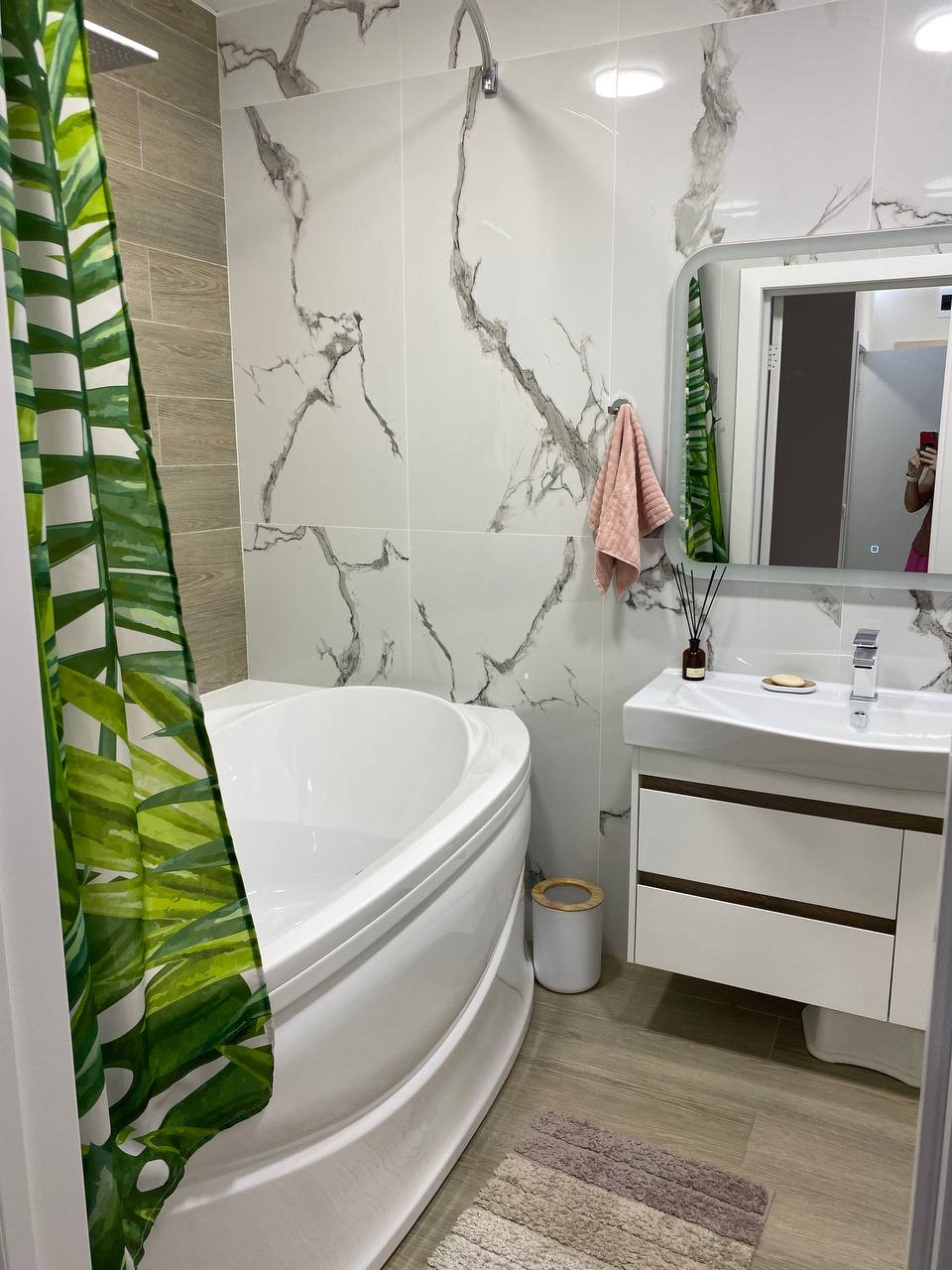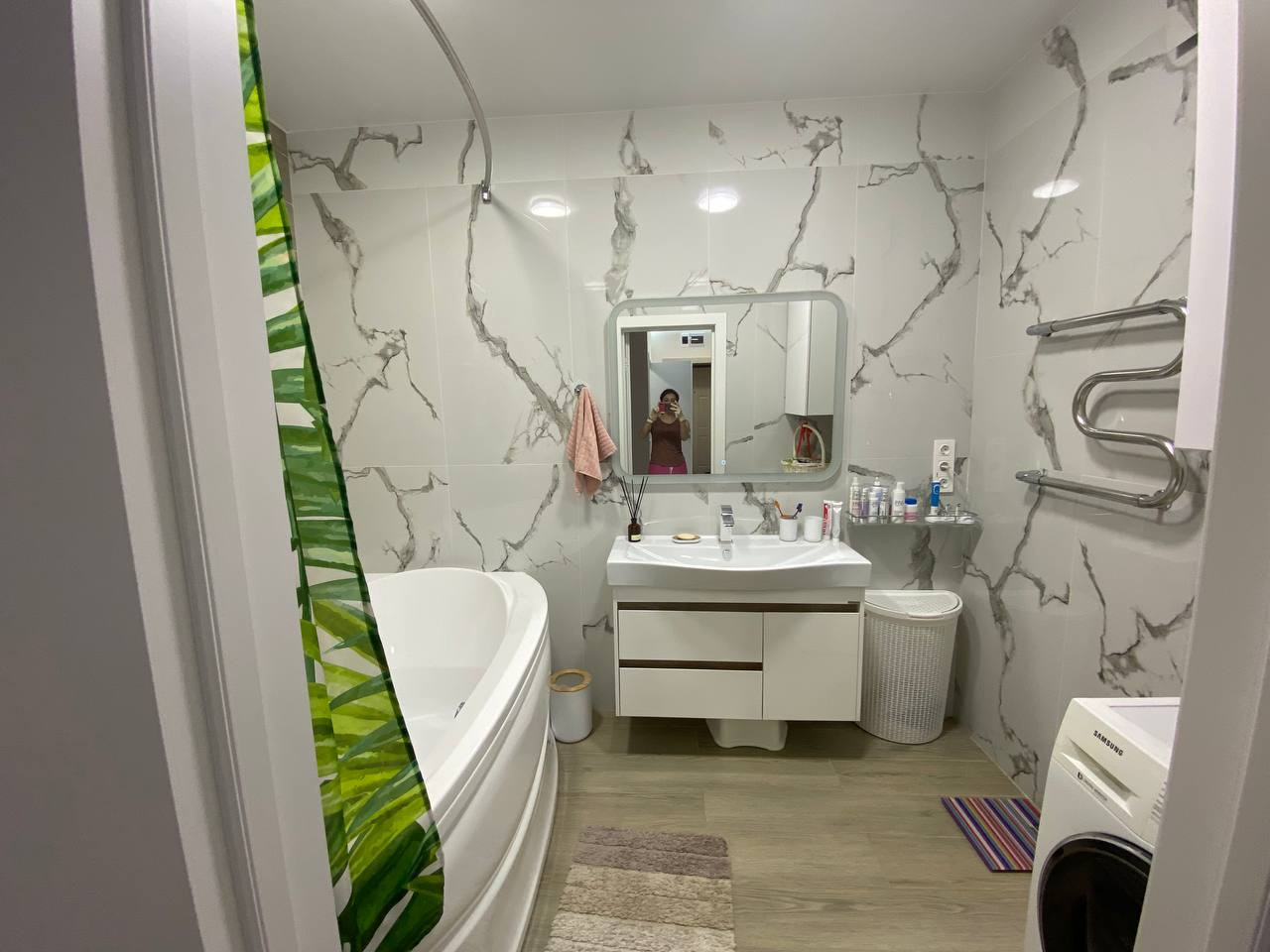 Ванная комната и туалет выложена широкоформатным керамогранитом 60*120 см. В сочетание с керамогранитом под дерево. Установлена большая ванная 190*120см. с тропическим душем. В туалете имеется гигиенический душ, вся сантехника фирмы GROHE.