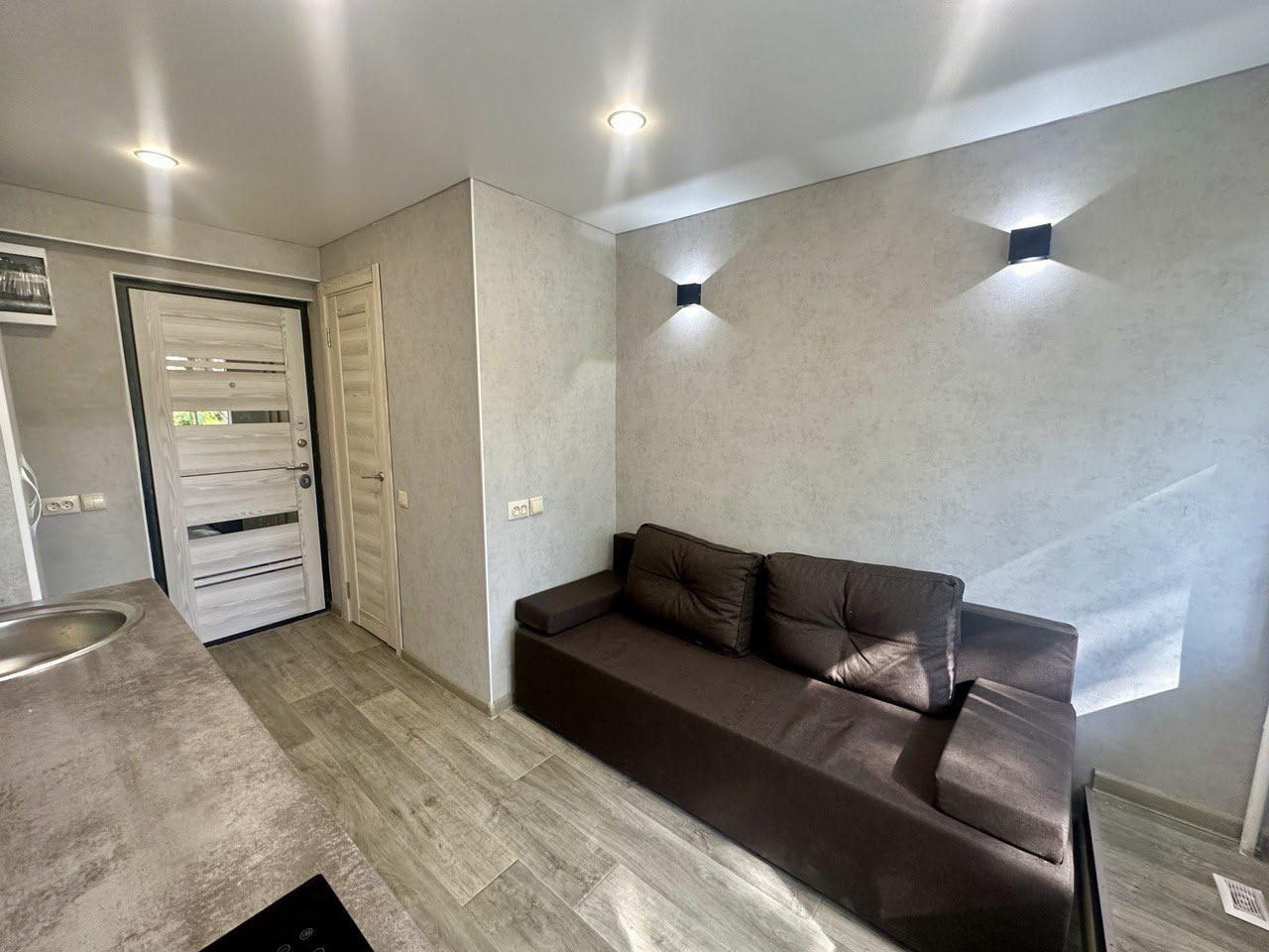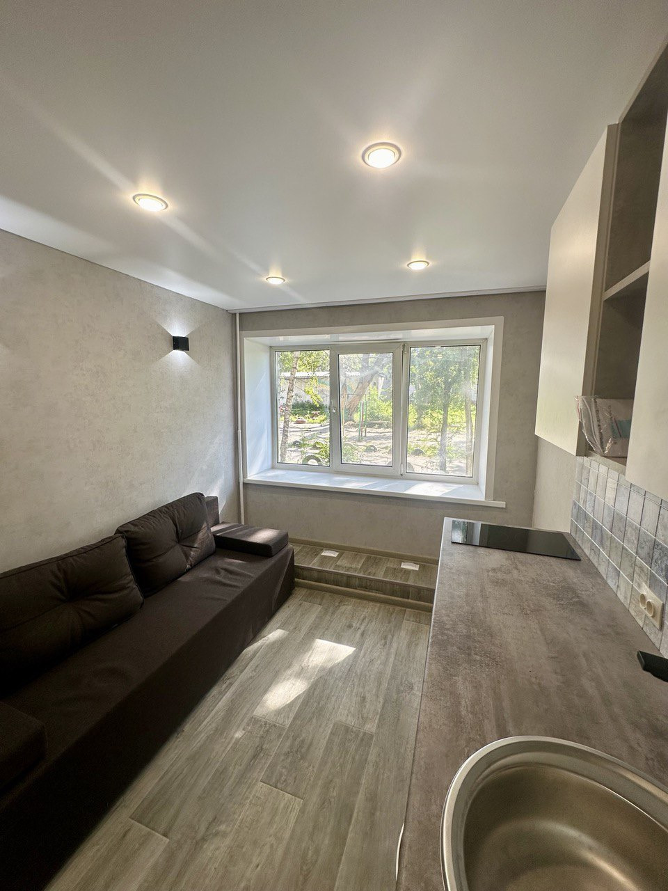 Сделан дорогой ремонт керамогранит, ламинат, обои, натяжные потолки, пластиковые окна, новая входная дверь!