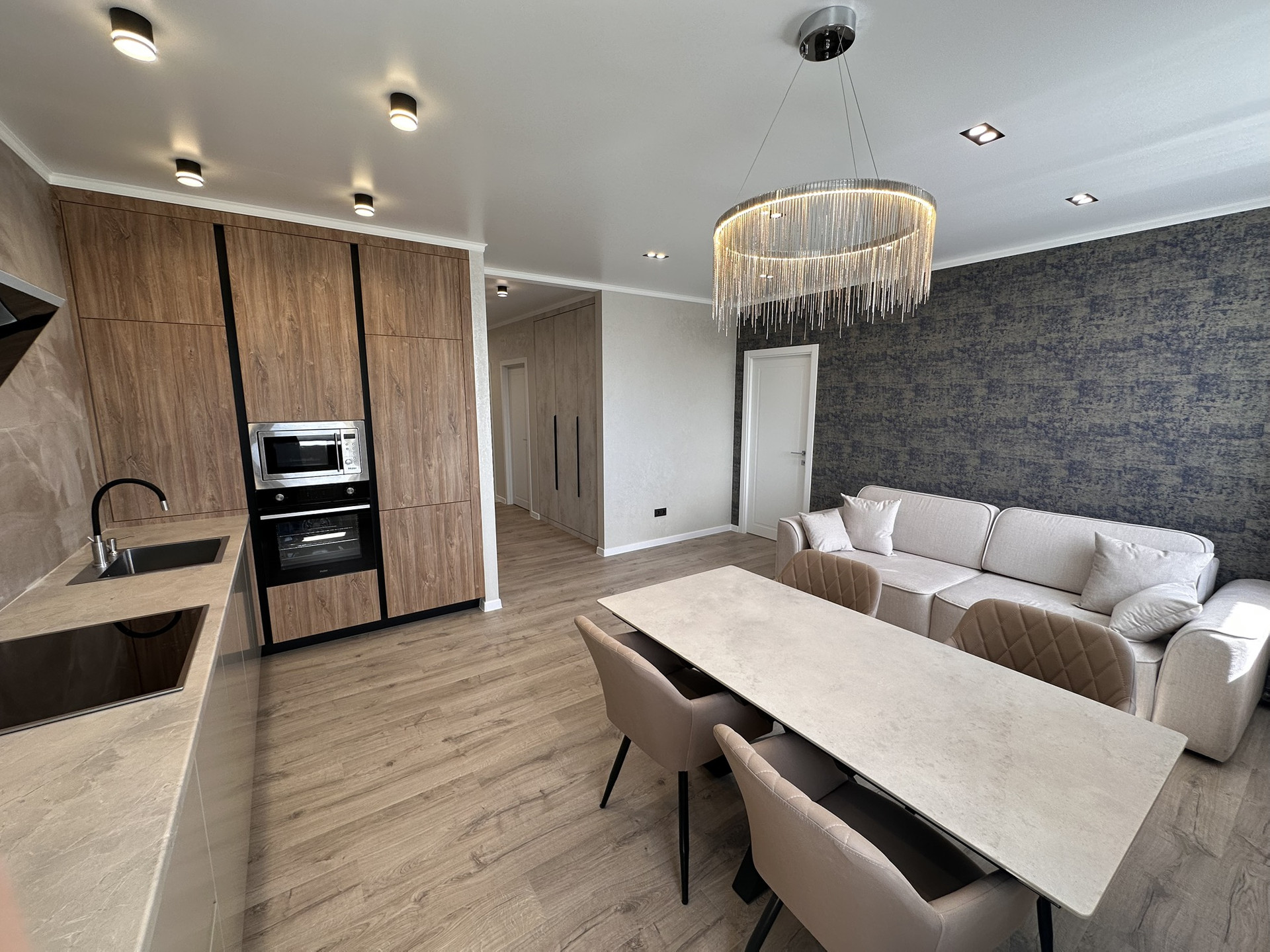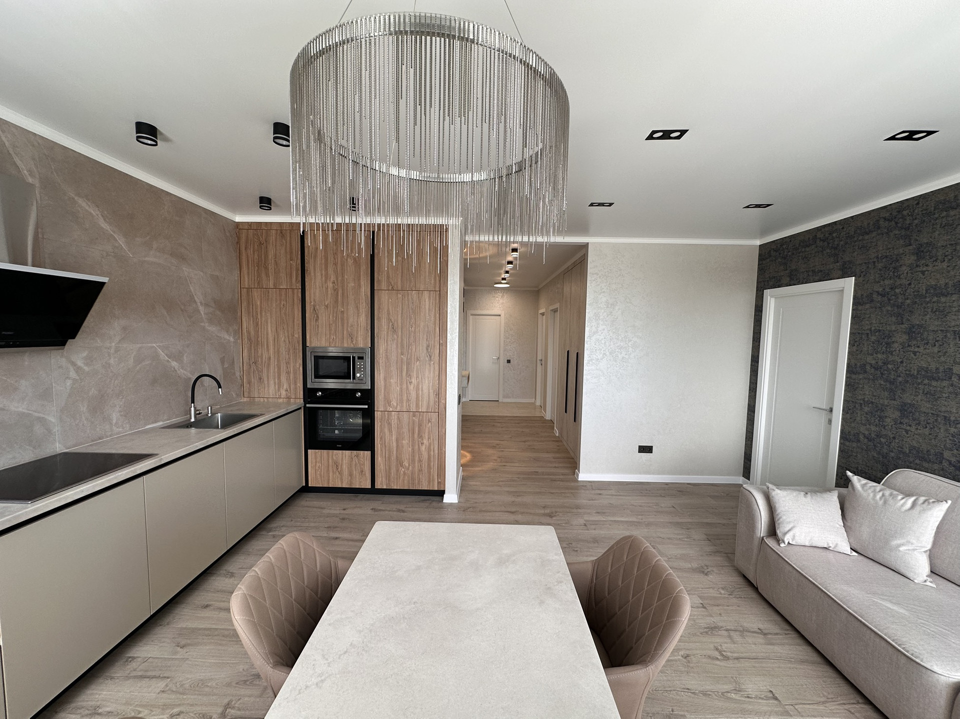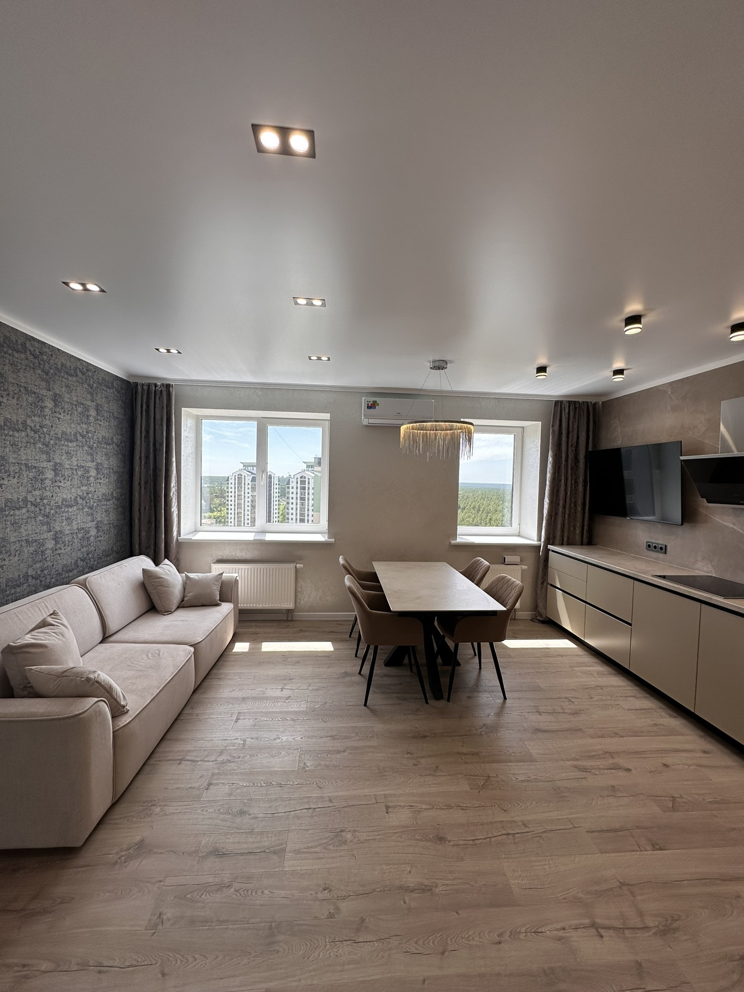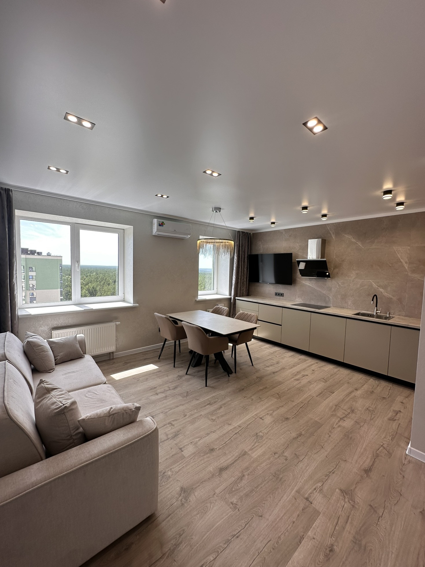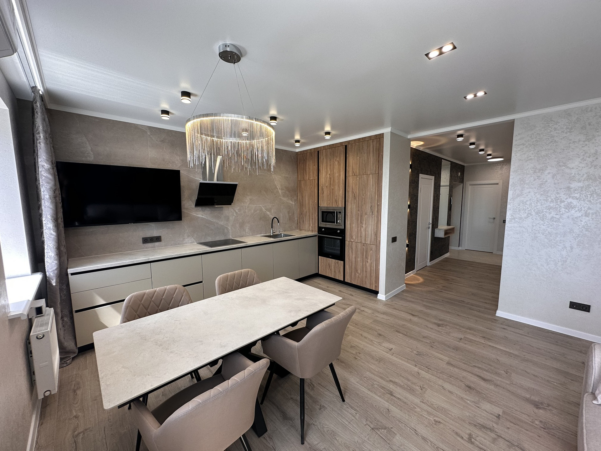 Квартира вся укомплектована мебелью и техникой, обеденный стол из керамогранита, стулья, тюль и шторы, кровать аскона, телевизор 55 дюймов, диван!!!