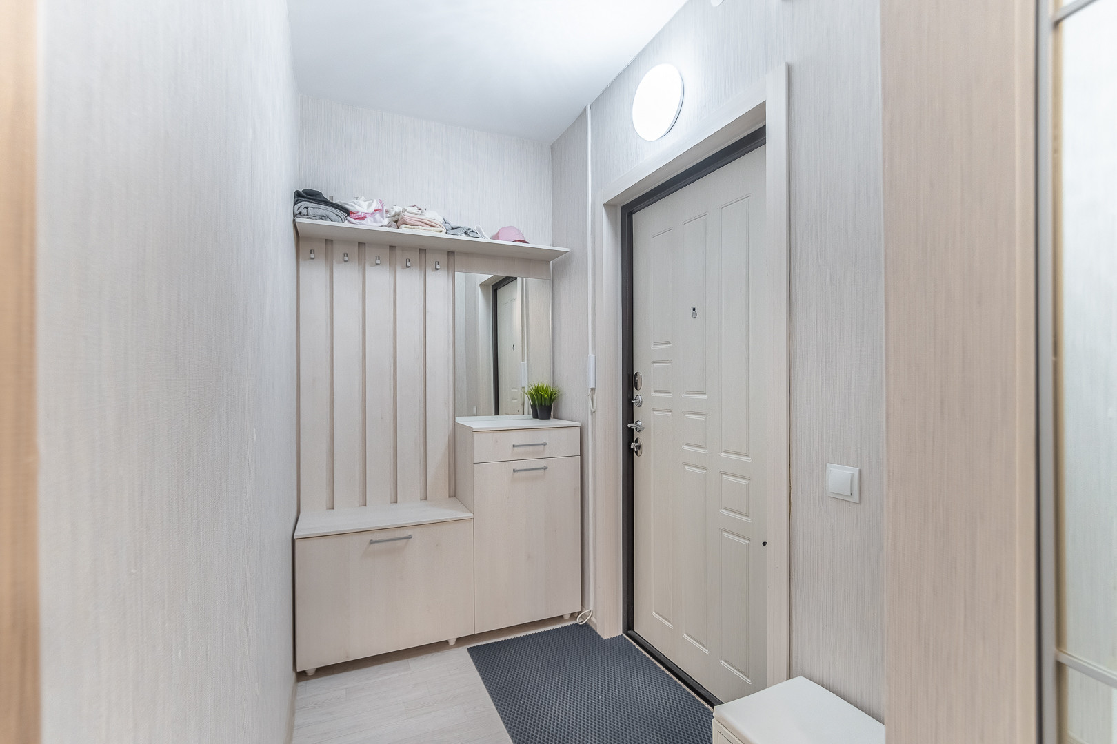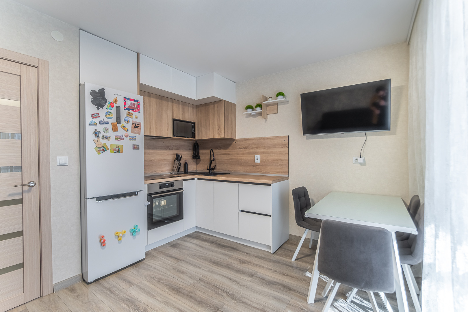 В подарок новосёлам оставим современный кухонный гарнитур, варочную панель, вместительный шкаф и приходую в коридоре, водонагреватель.