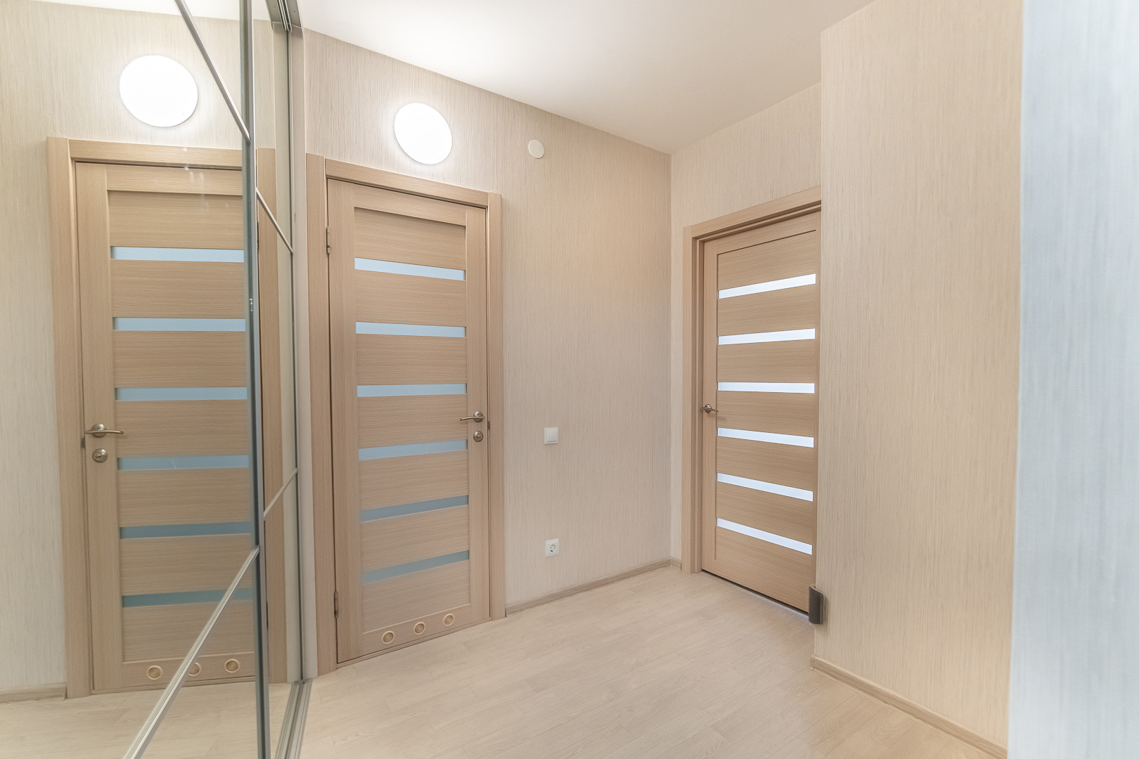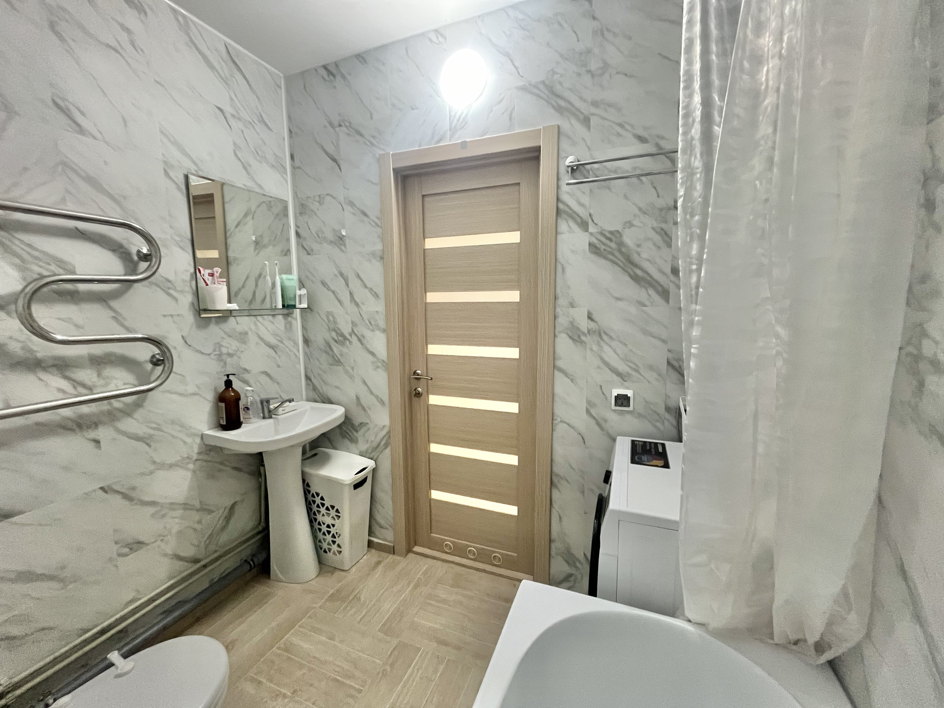 На полу ламинат, натяжные потолки, современные межкомнатные двери, выполнен свежий ремонт в ванной комнате.