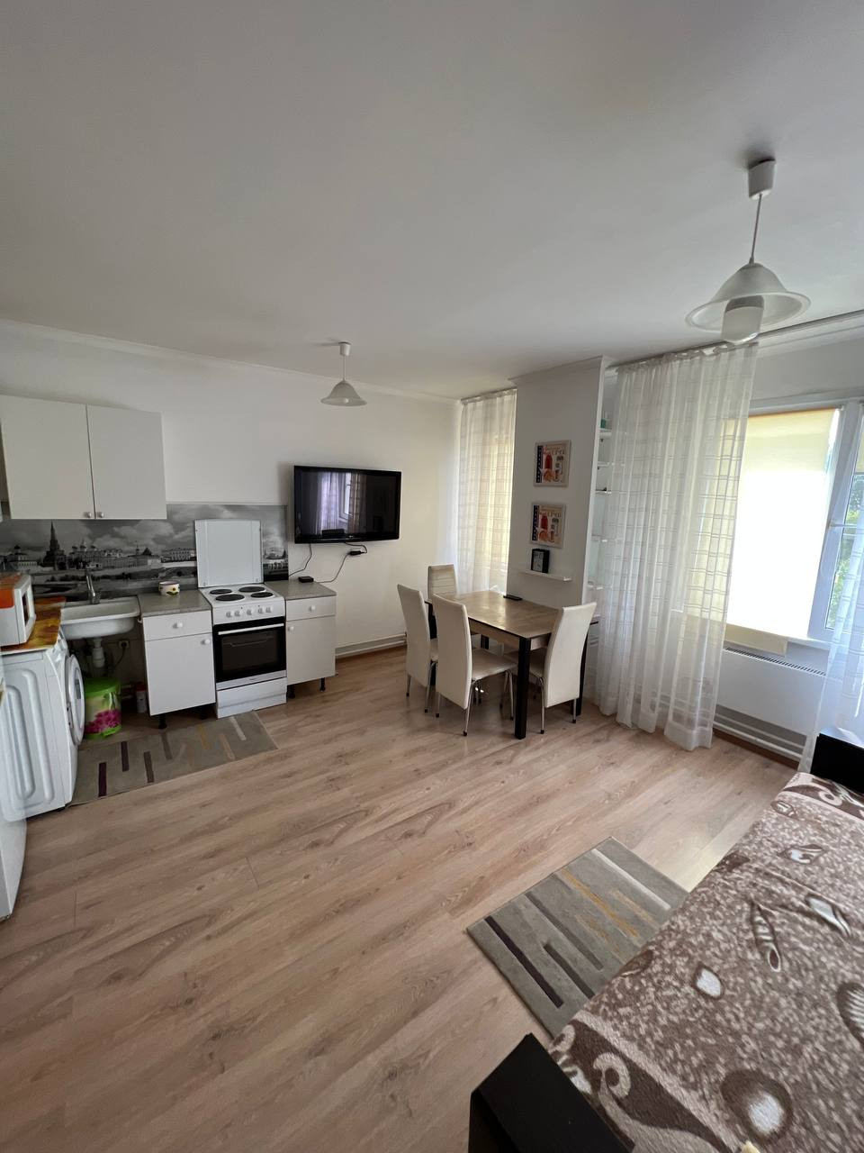 3. Очень уютная кухня, в которой Вы можете устремиться навстречу вечернему закату и выпить чашку ароматного чая или кофе. На кухне остается мебель и техника (стиральная машина,плита, микроволновая печь, холодильник), обеденная зона, телевизор и даже шторы для новых хозяев!