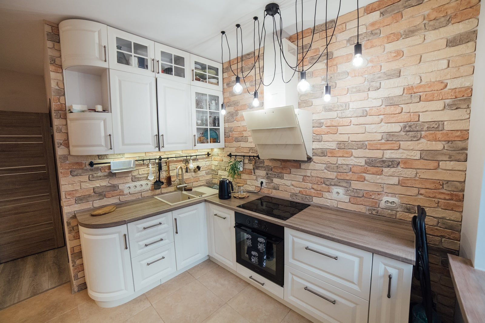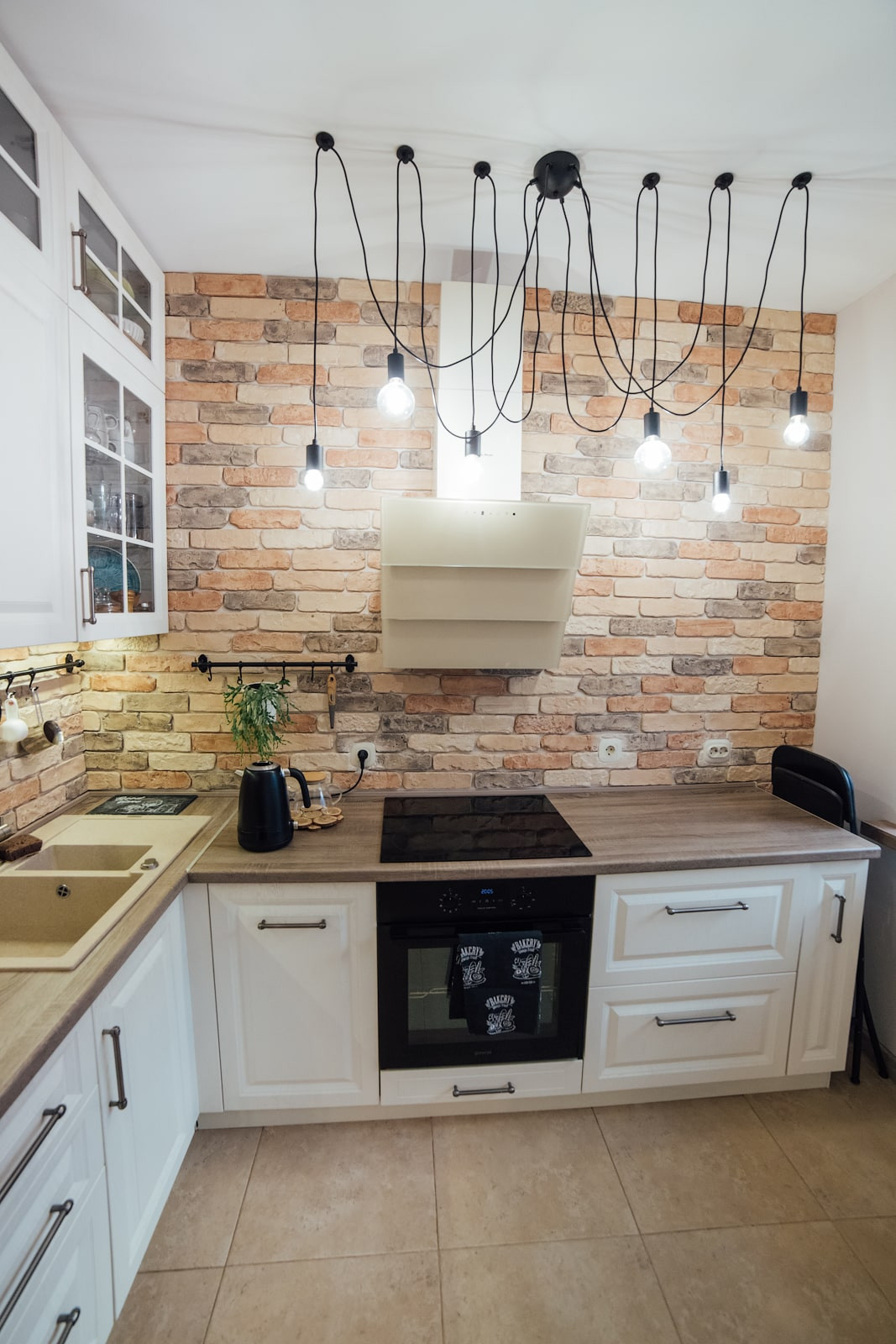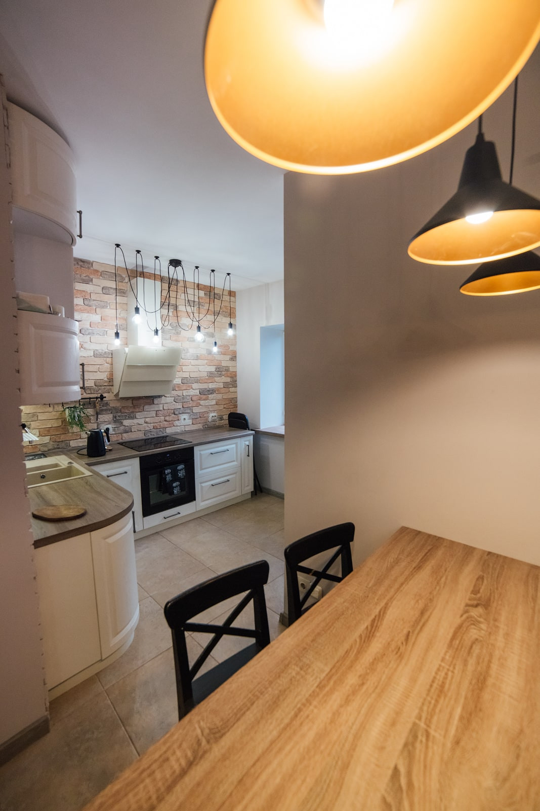 Зона приготовления пищи не перегружена навесными шкафами, выглядит интересно за счет кирпичной отделки стены и светильника с семью декоративными лампами. Светлый кухонный гарнитур был сделан на заказ именно под эту конфигурацию помещения. Он очень вместительный и качественный, все дверцы имеют доводчики. Столешница сохранилась в идеальном состоянии.