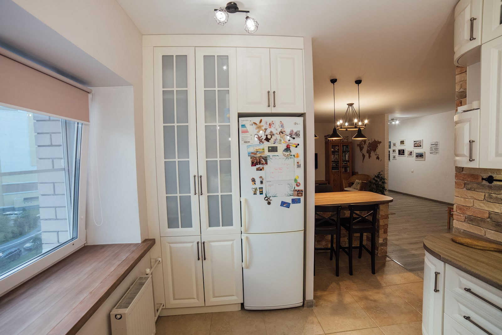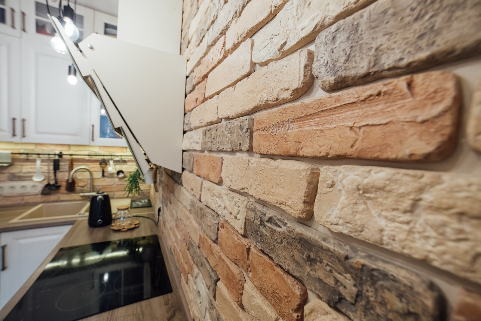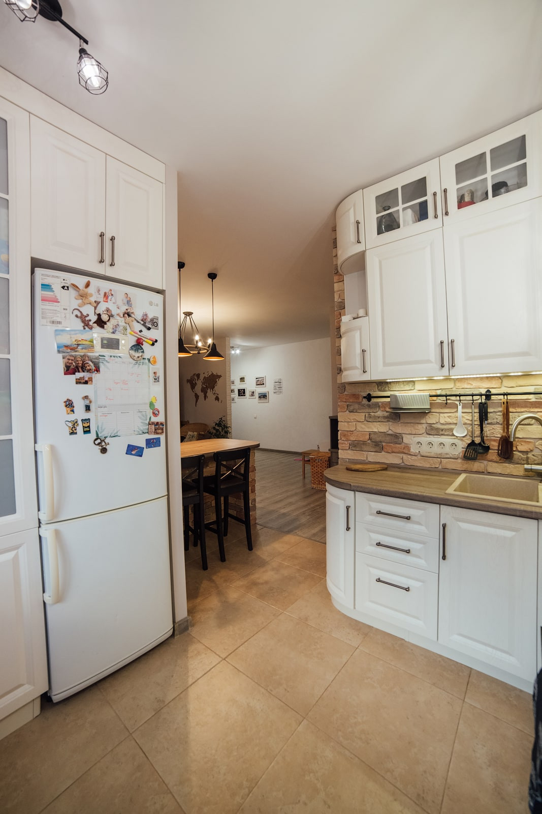 Зона приготовления пищи не перегружена навесными шкафами, выглядит интересно за счет кирпичной отделки стены и светильника с семью декоративными лампами. Светлый кухонный гарнитур был сделан на заказ именно под эту конфигурацию помещения. Он очень вместительный и качественный, все дверцы имеют доводчики. Столешница сохранилась в идеальном состоянии.