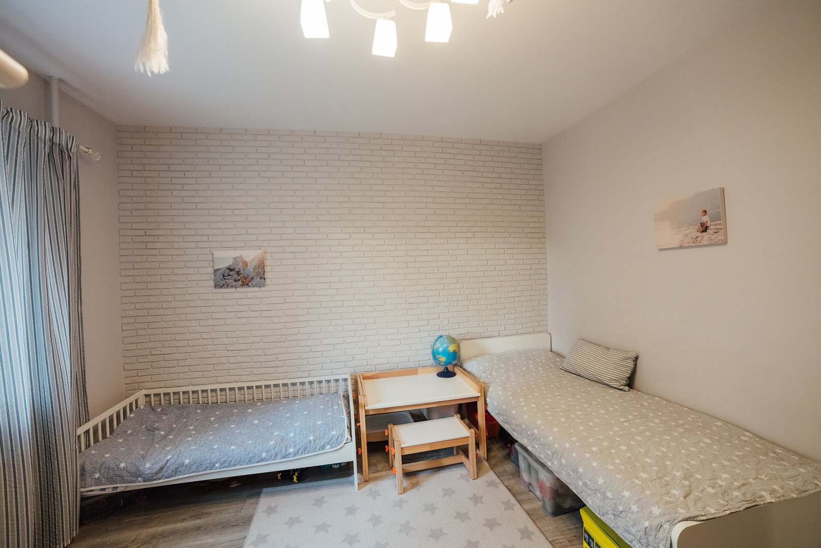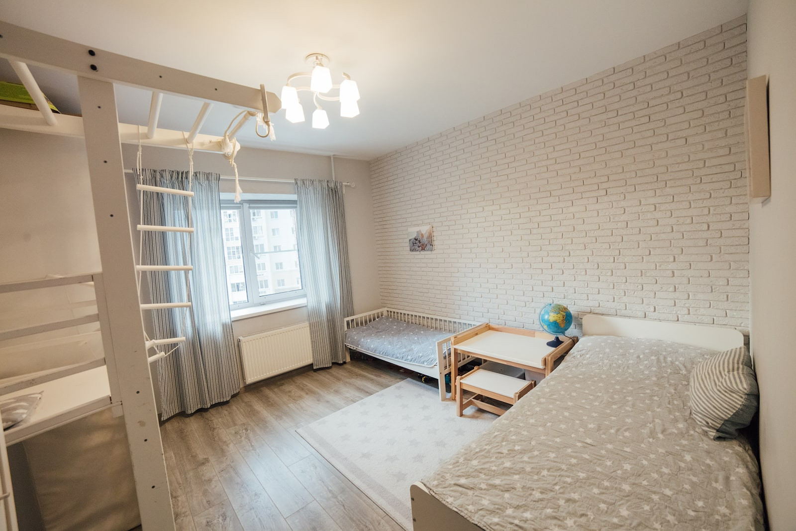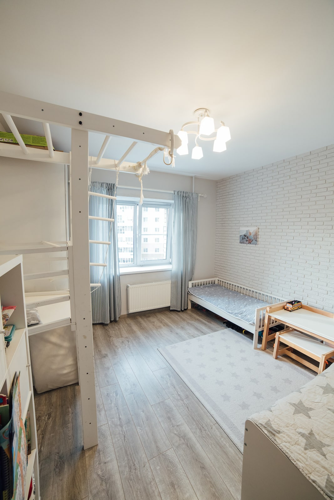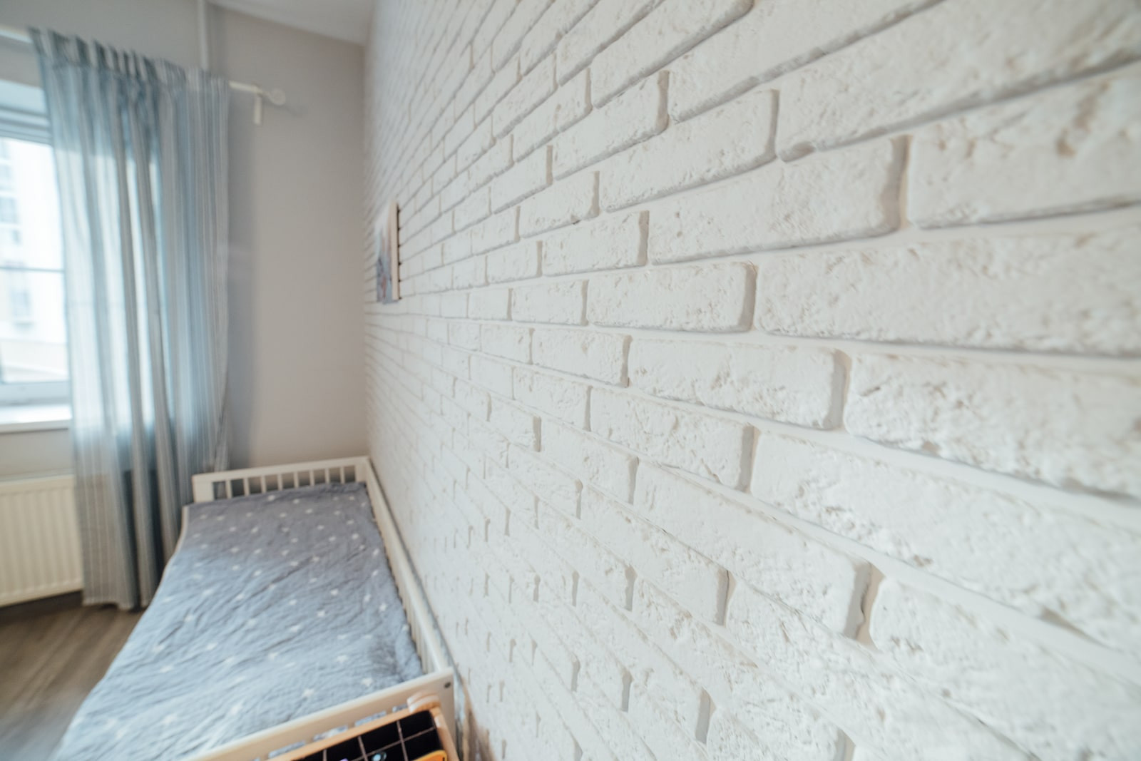Стены в детской ровно оштукатурены и покрашены, одна стена выполнена из декоративного кирпича. Как и в спальне, полностью заменено окно, установлен 3х-камерный стеклопакет с утолщенным передним стеклом, проведена шумоизоляция оконного проема. На окна установлены не пропускающие свет рулонные шторы (blackout).