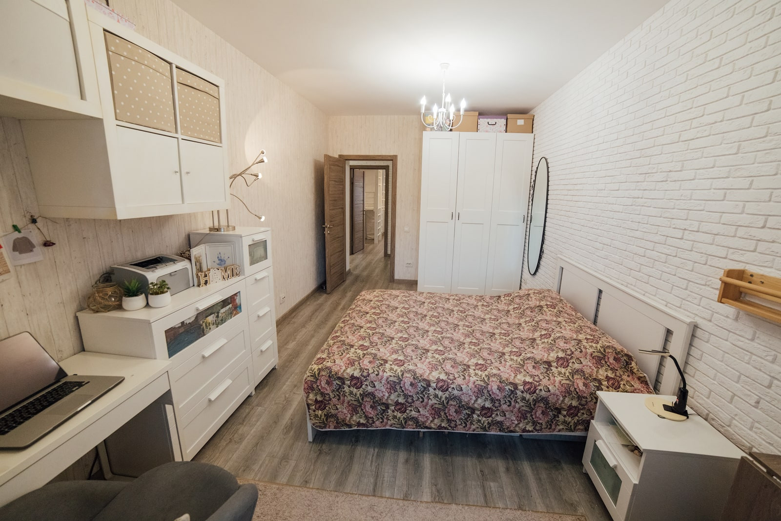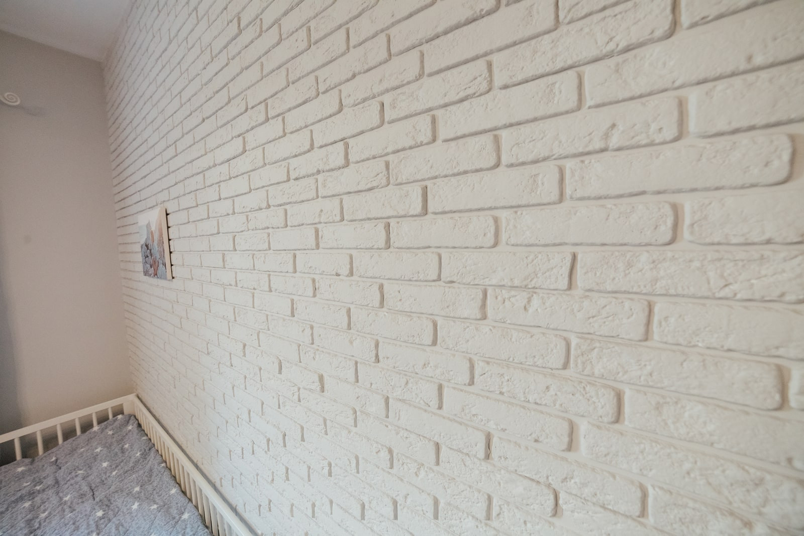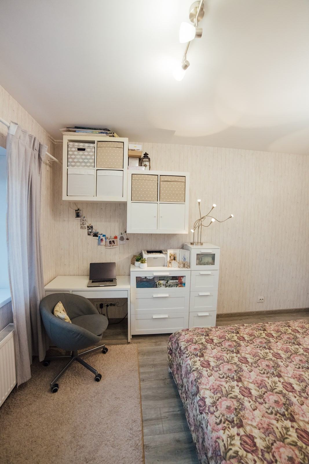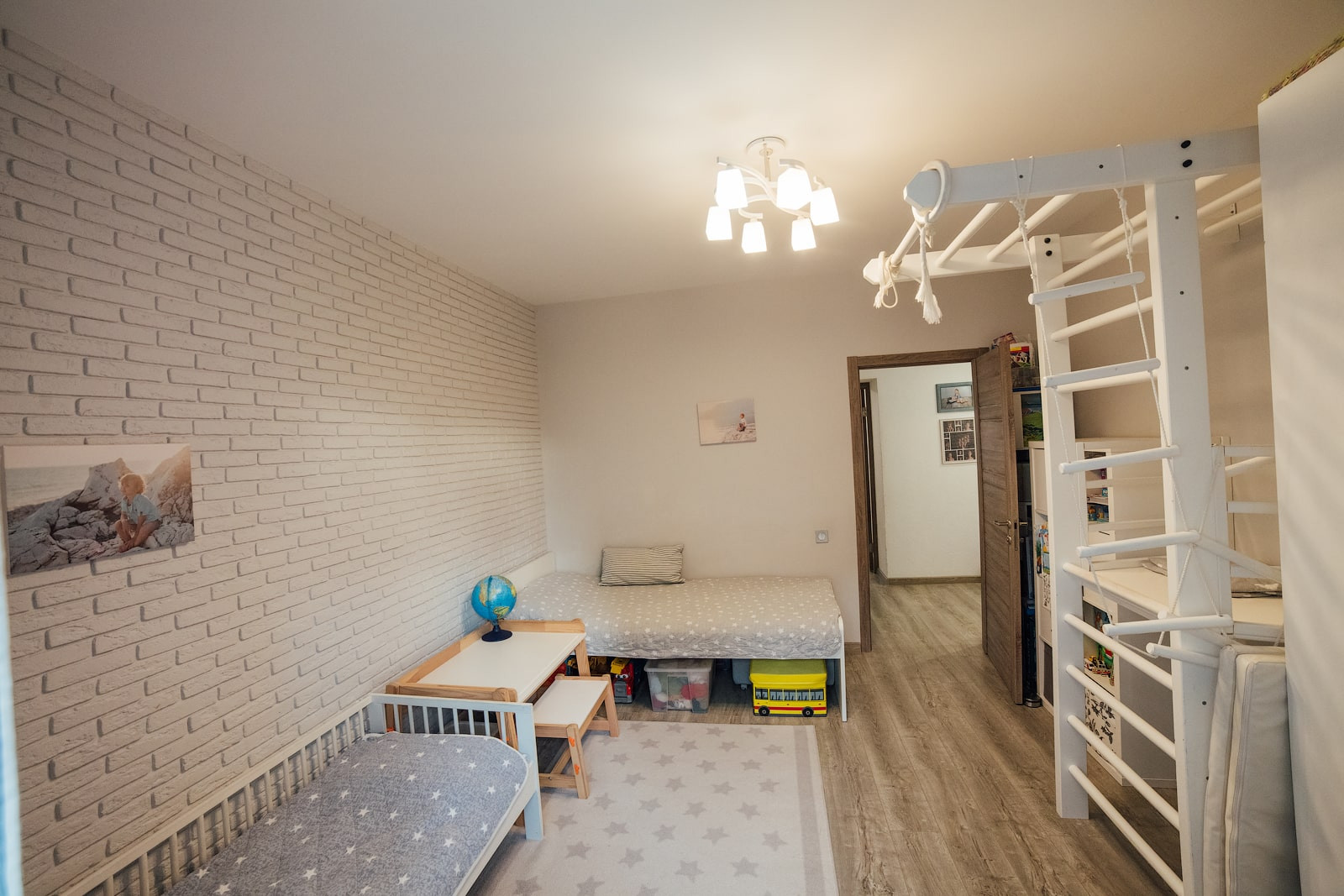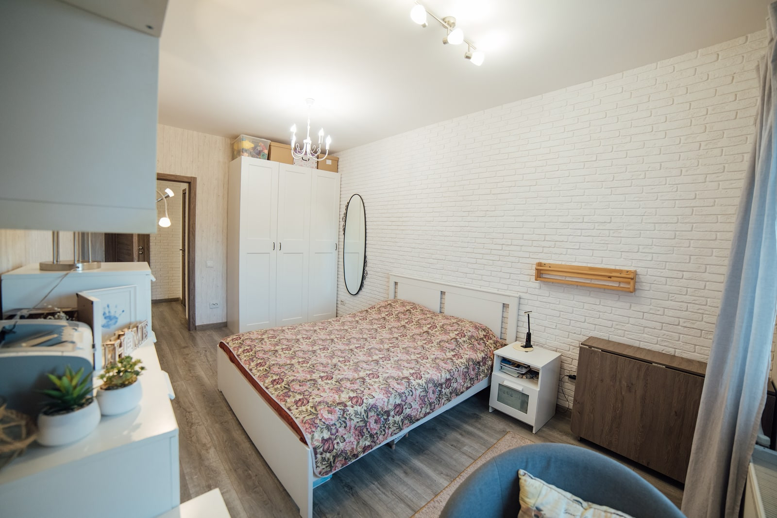 Стены в детской ровно оштукатурены и покрашены, одна стена выполнена из декоративного кирпича. Как и в спальне, полностью заменено окно, установлен 3х-камерный стеклопакет с утолщенным передним стеклом, проведена шумоизоляция оконного проема. На окна установлены не пропускающие свет рулонные шторы (blackout).