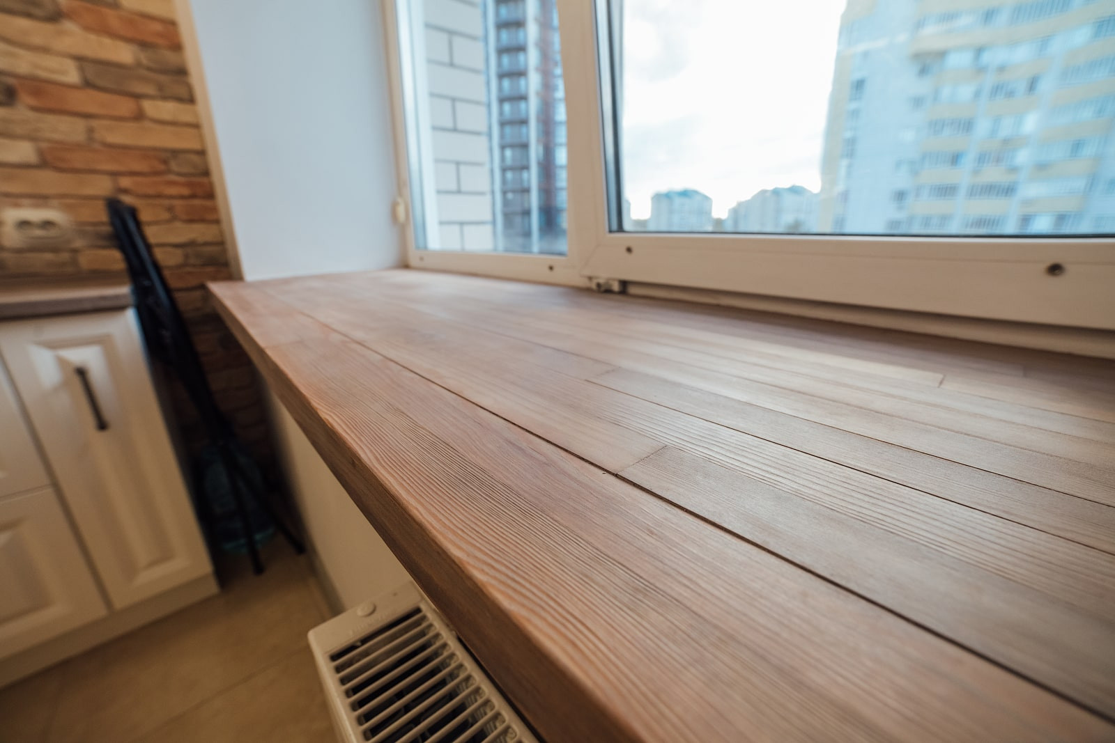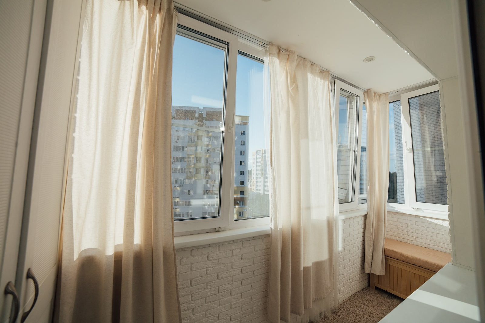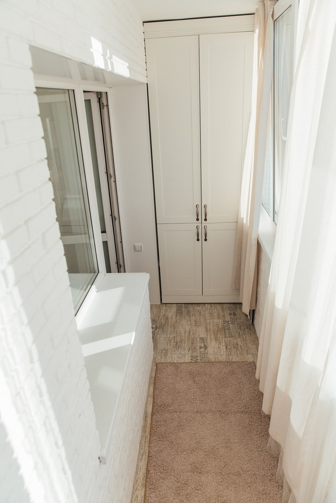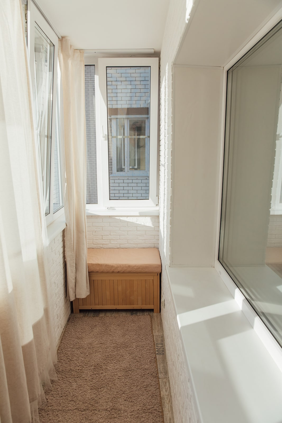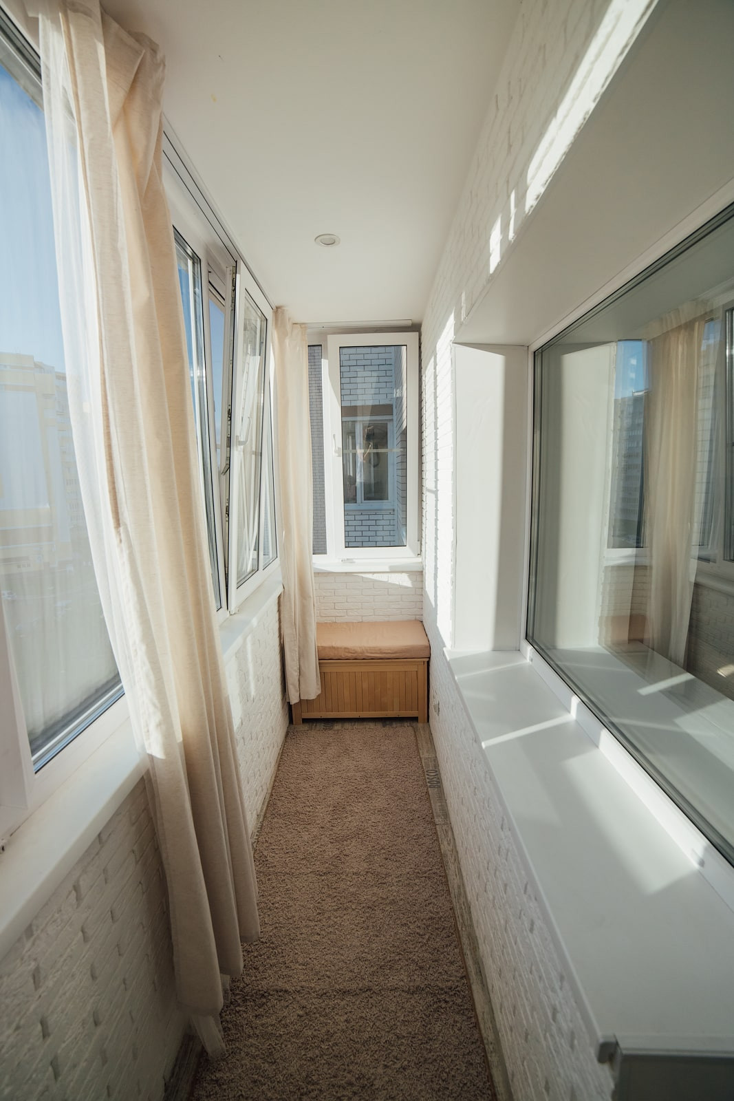 Отделка стен лоджии — декоративный кирпич, пол — керамическая плитка. Все стеклопакеты от застройщика заменены на 3х-камерные. Также на лоджию выведен электрический теплый пол, благодаря чему здесь комфортно находиться практически круглый год. На лоджии есть встроенный шкаф для хранения, изготовленный в размеры стены. Очень качественный, все дверцы с доводчиками.