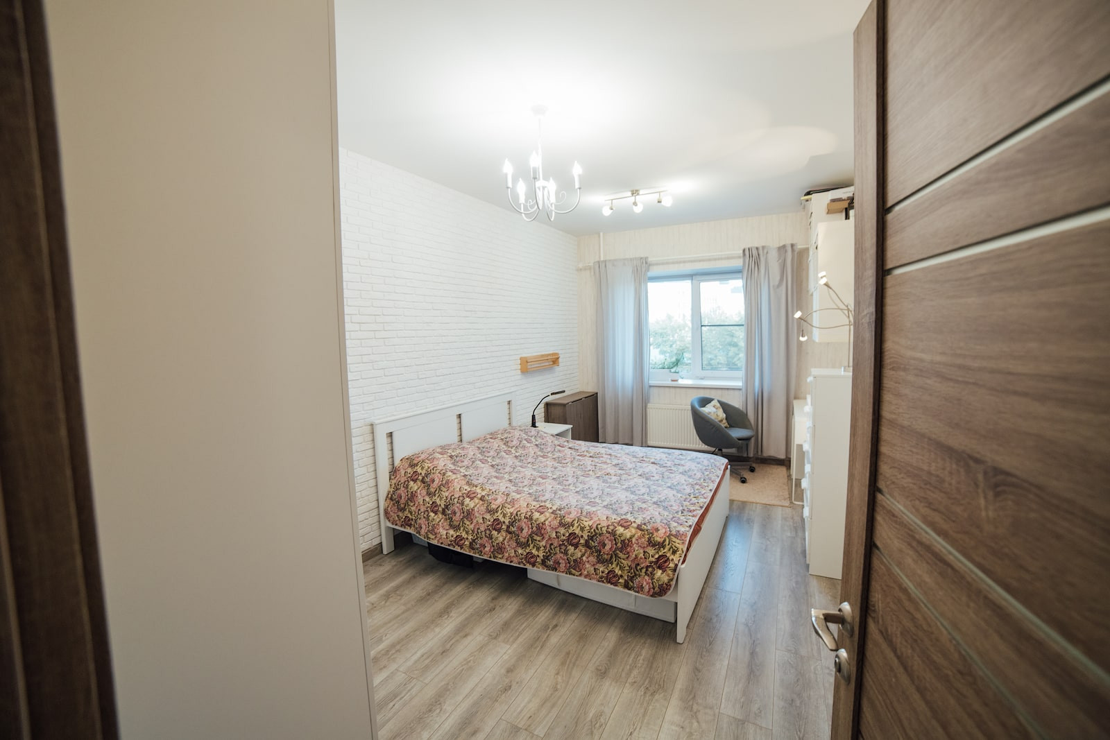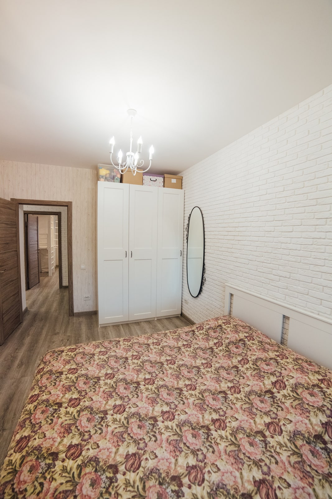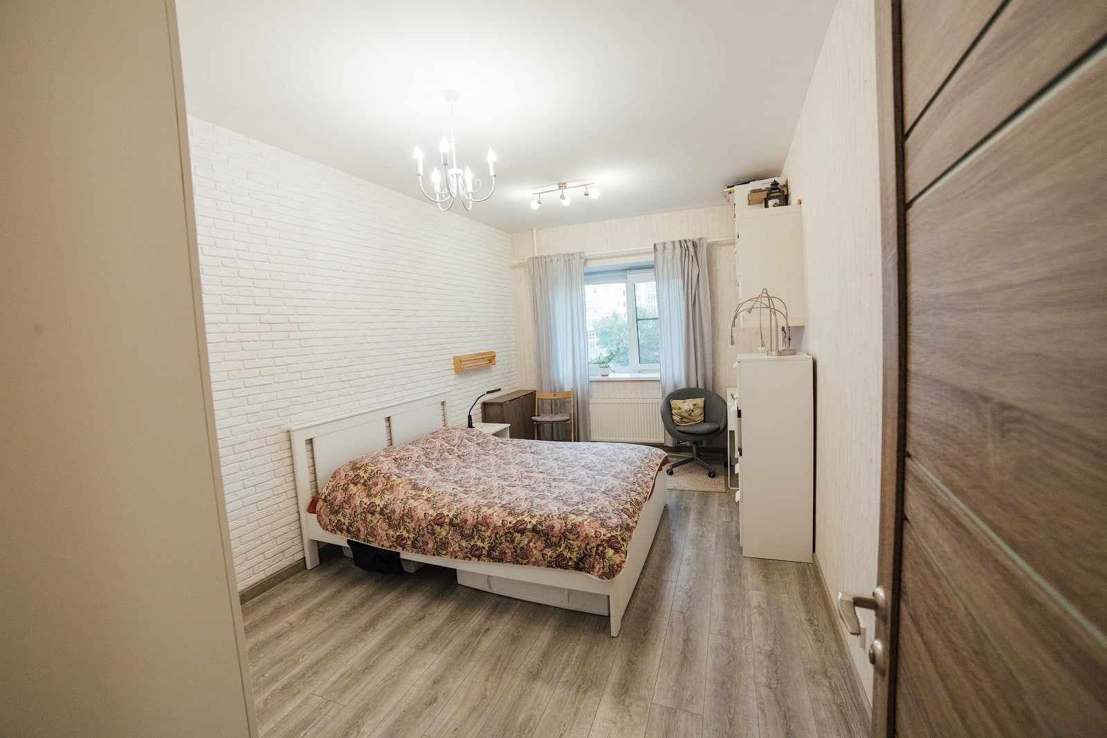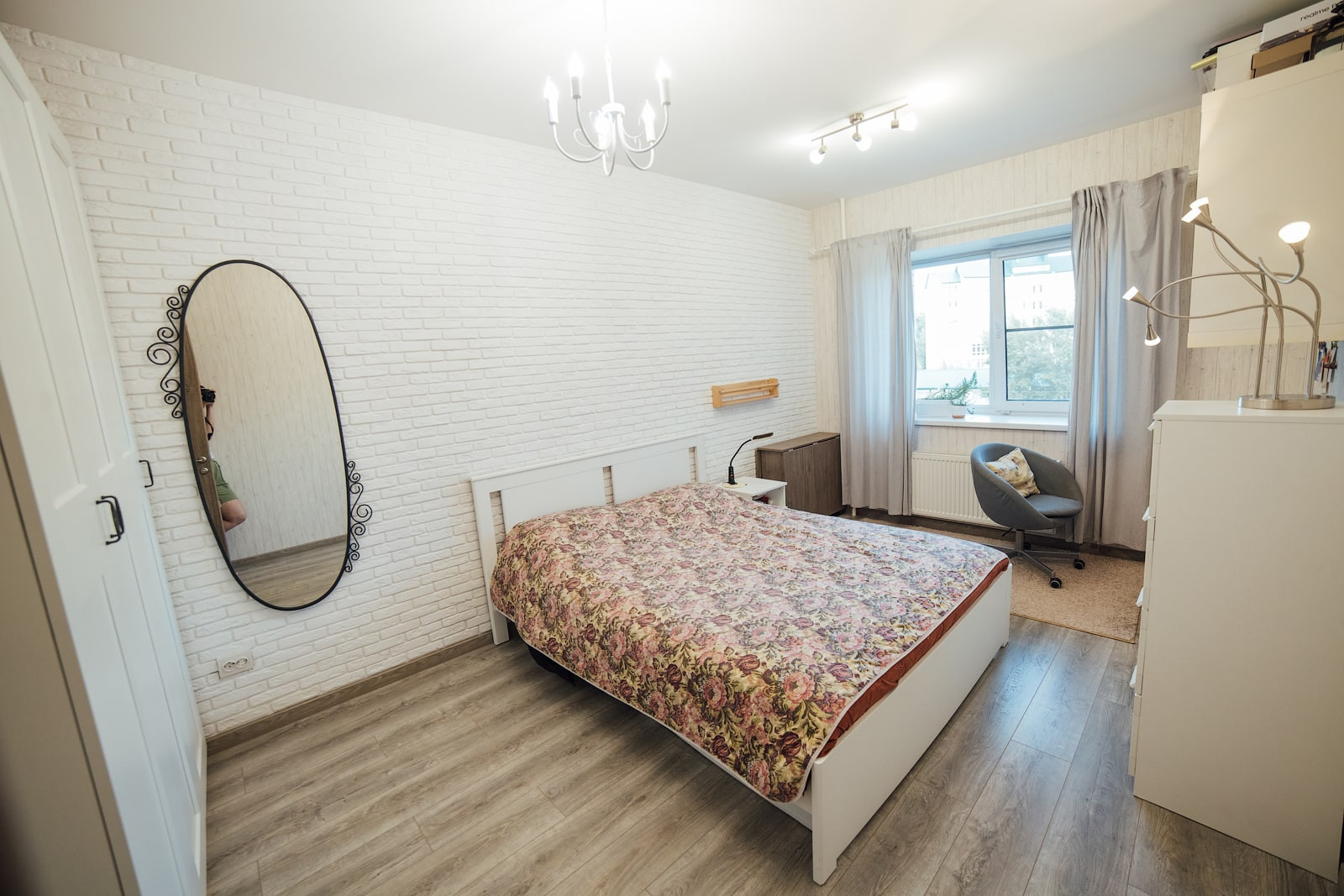 Отделка стен — стильные обои с эффектом дерева, одна стена — декоративный кирпич. Полностью заменено окно, выходящее на Змеиногорский тракт, 3х-камерный стеклопакет с утолщенным передним стеклом, проведена шумоизоляция оконного проема. Это на 100% решило проблему с посторонними звуками, в том числе стук от трамваев, гул от дороги — их просто не слышно. На окна установлены не пропускающие свет рулонные шторы.