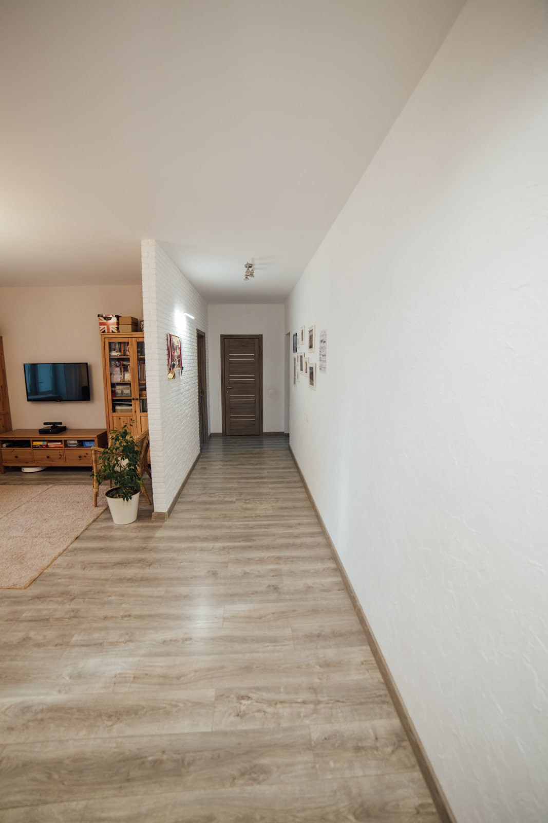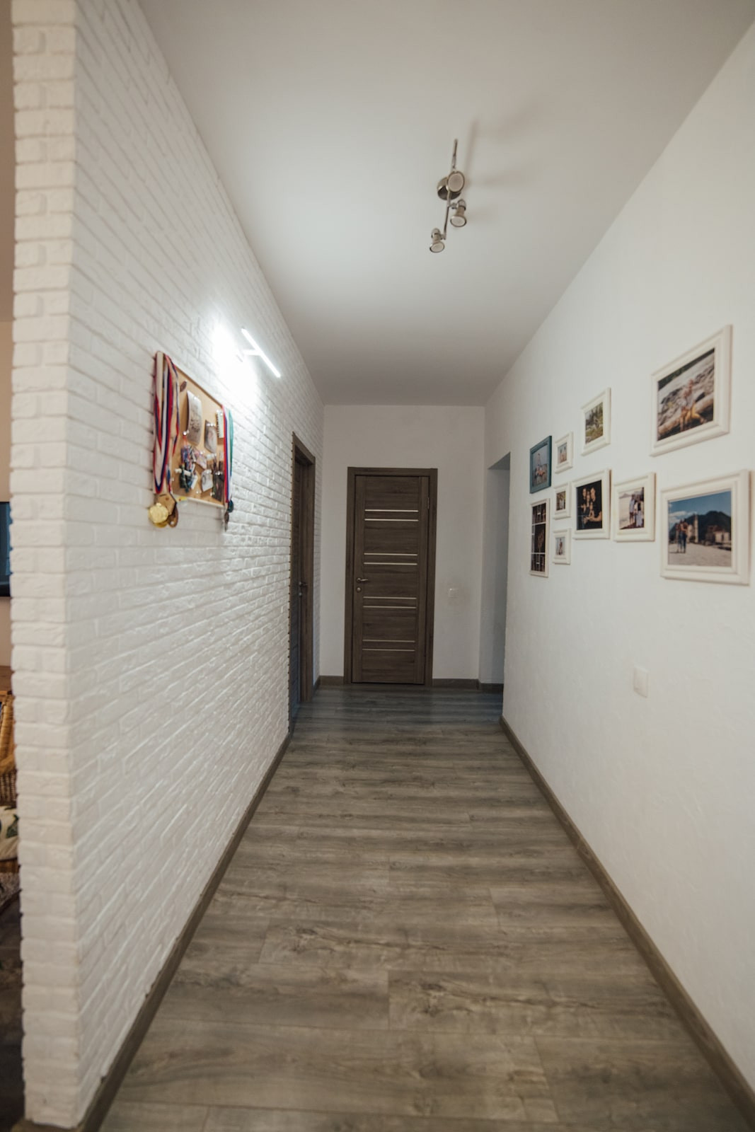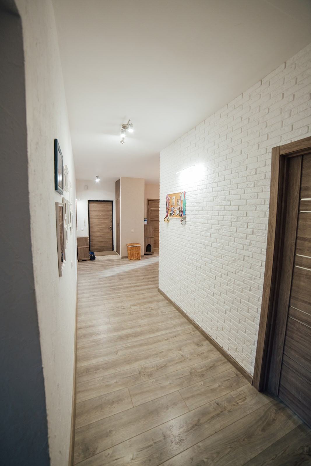 Коридор выполнен в светлых тонах для расширения пространства. Стены сделаны из неубиваемой декоративной штукатурки (очень легко мыть!), одна стена — декоративный кирпич. Освещение в коридоре — два 3х-точечных светильника.