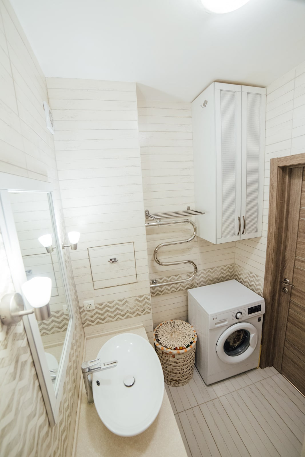 В ванной установлен водонагреватель, который мы заботливо спрятали в навесной шкаф, чтобы он не портил вид. Качественная и надежная сантехника. Рядом с ванной предусмотрены полочки для хранения шампуней и прочих принадлежностей.
