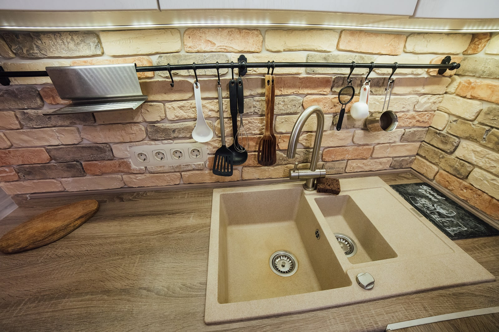 Пол в зоне кухни — керамическая плитка, под ней — электрический теплый пол. Одна стена полностью отделана декоративным кирпичом, обработанным специальной пропиткой — чтобы с него легко отмывался жир. Остальные стены кухни — декоративная краска на основе кварцевого грунта.