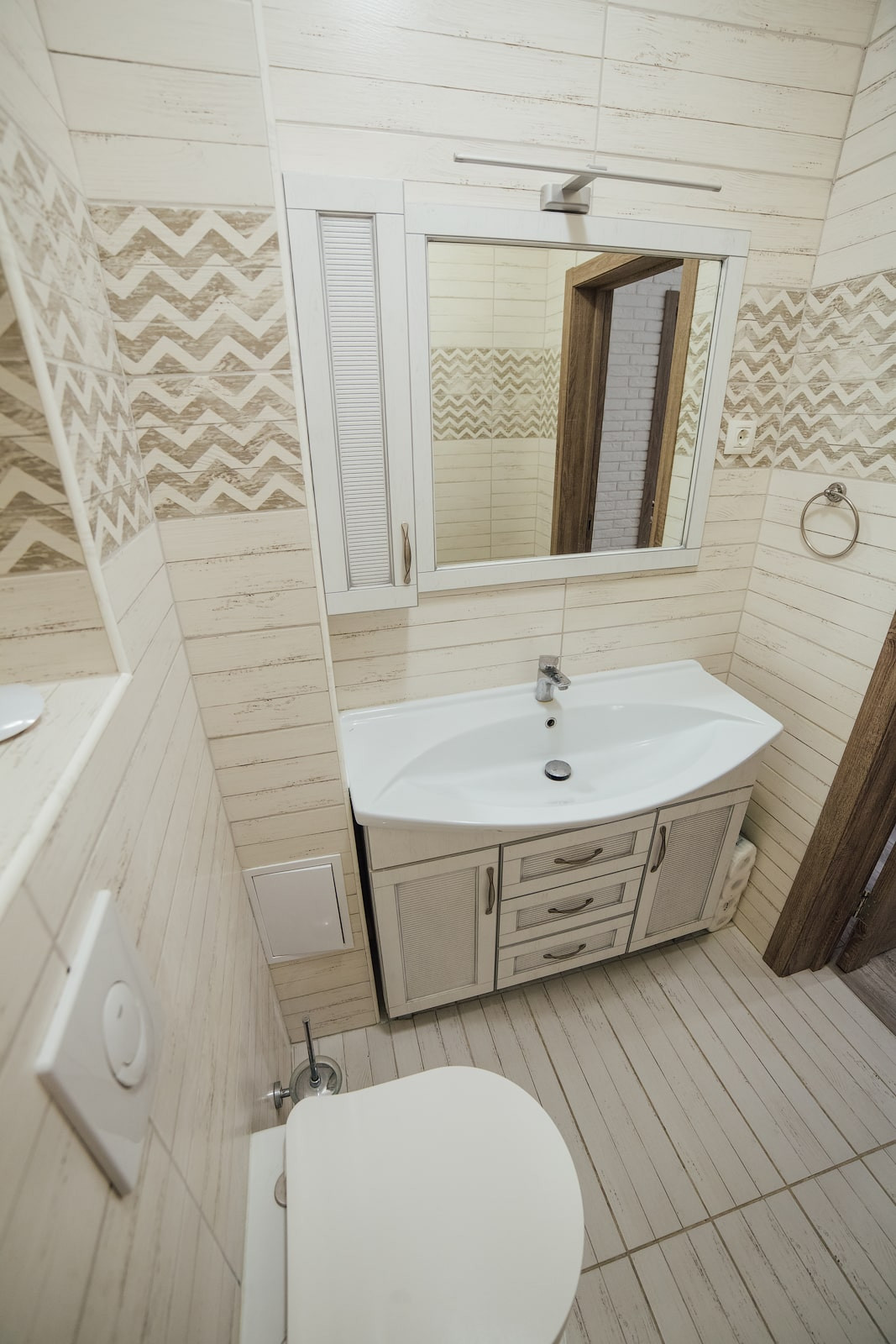 Ванная комната находится рядом с кухней, туалет — недалеко от спальни и детской. В обоих санузлах установлен электрический теплый пол, а также системы вытяжки воздуха.