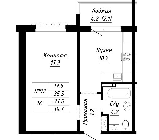 Общая площадь 39.7 м2