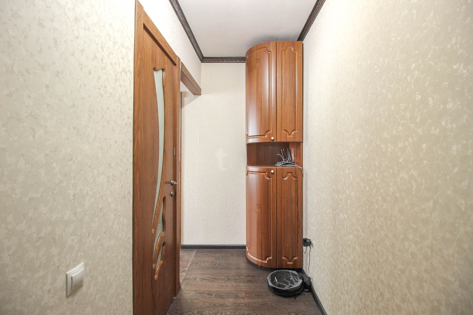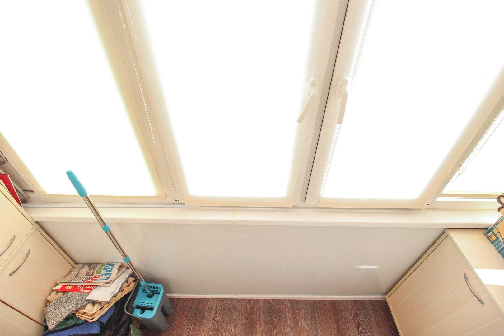 -балкон застеклен(дополнительно утеплен, теплый пол, шкафы, сушилка для белья ,на полу линолеум).