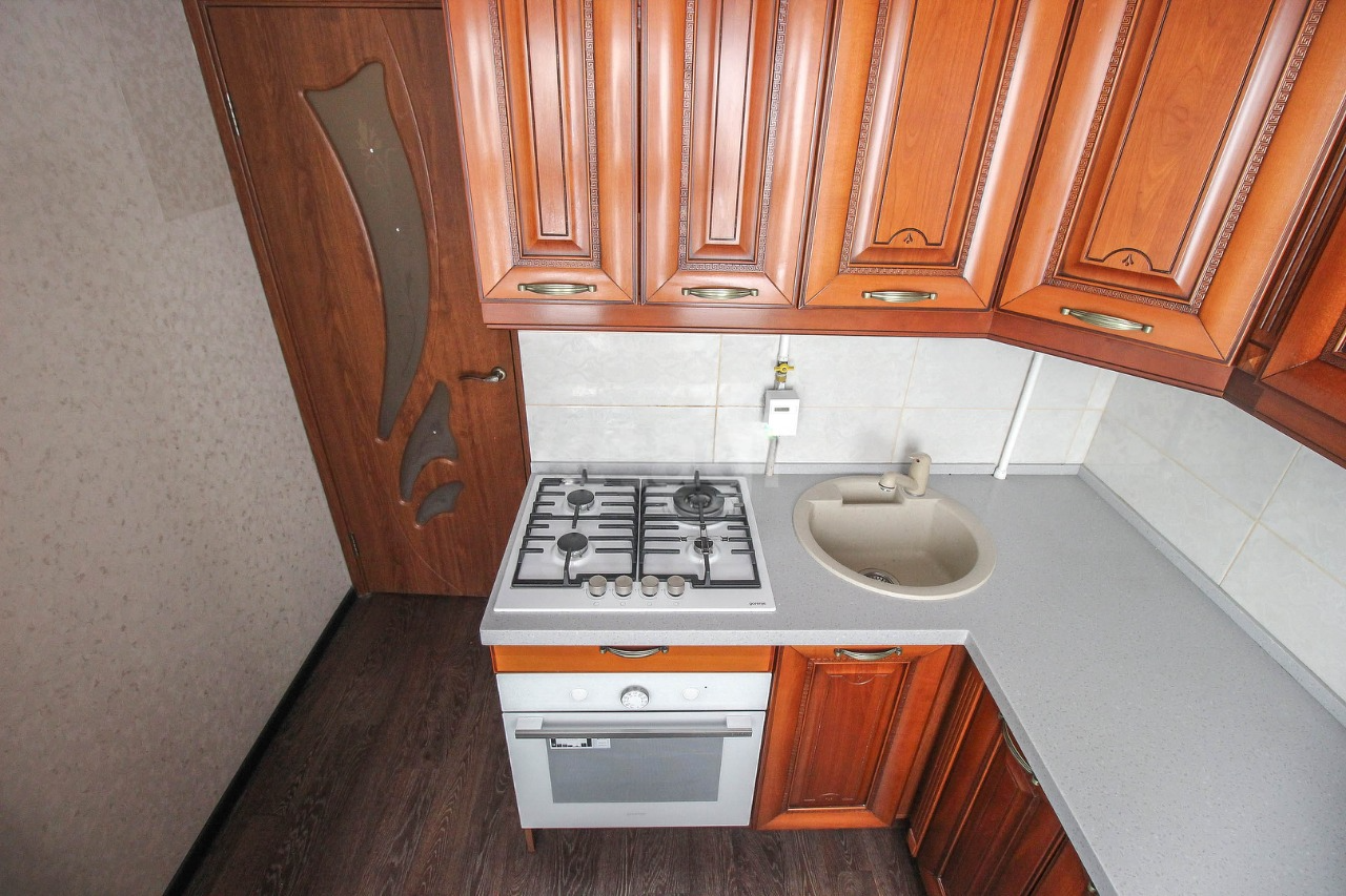 Установлен кухонный гарнитур из массива дерева (варочная газовая панель +духовой электрический шкаф остаются), установлен газовый счетчик.