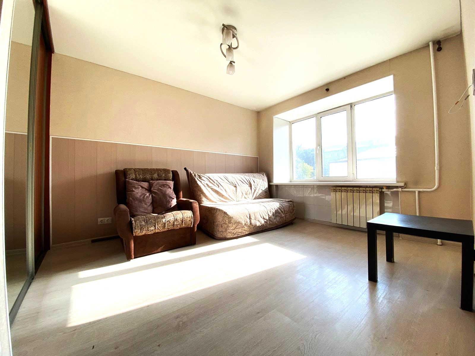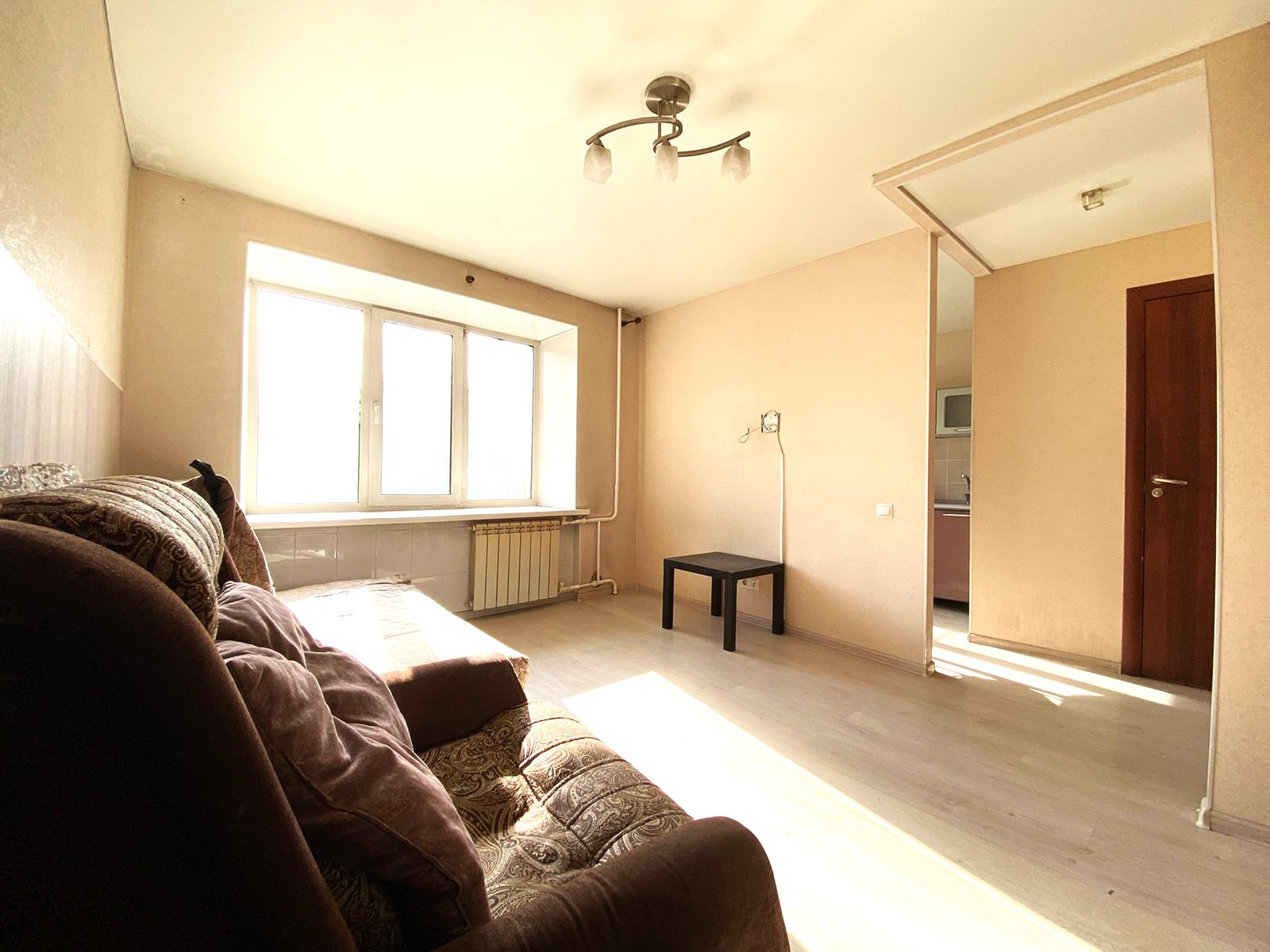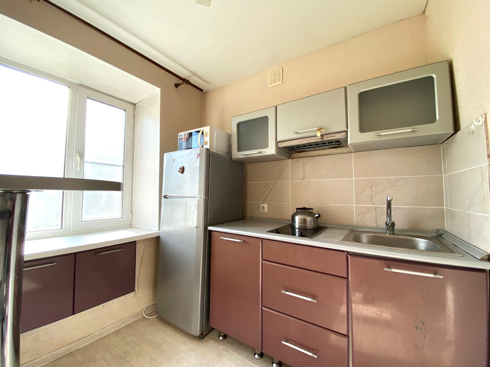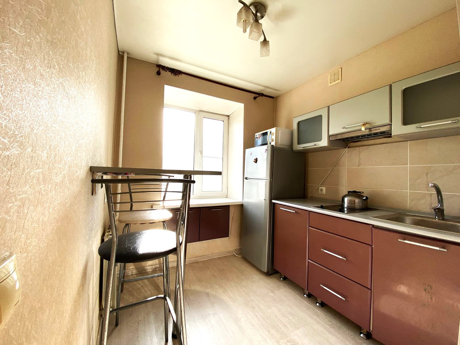 Состояние квартиры хорошее, все сделано, имеется огромный вместительный шкаф-купе, спальные места, полностью укомплектованная кухня (гарнитур ,варочная панель, холодильник, микроволновая печь, барная стойка, стулья). Сан узел совмещенный, установлен водонагреватель и стиральная машина. Окна пластиковые, радиаторы отопления алюминиевые, потолки натяжные, на полу ламинат, дверь входная металлическая. Квартира готова для сдачи или проживания, пустая, ждет нового хозяина.
