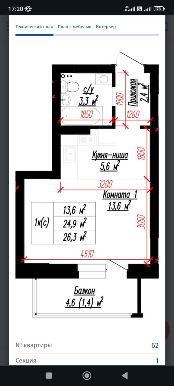 Общая площадь 24.9 м2