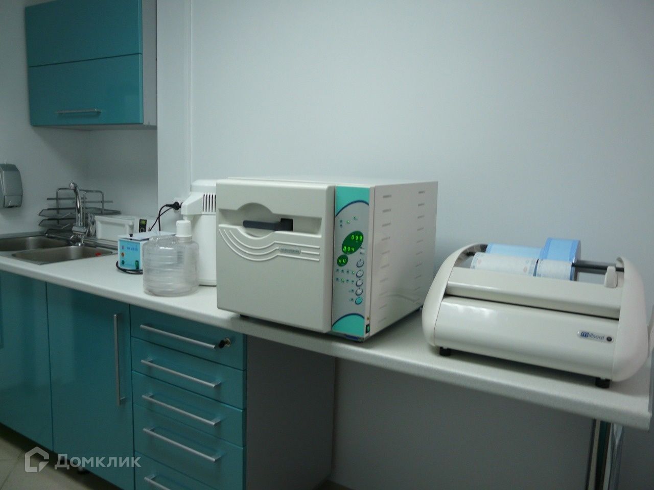 В клинике два стоматологических кабинета меблированы навесными полками с дверцами и напольными шкафами со столешницами, двойными раковинами (в кабинете стоматолога хирурга с локтевым смесителем) и столиками врача с четырьмя ящиками.