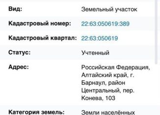 Продам участок для постройки индивидуального жилого дома рядом с перекрестком ул.Мамонтова/пер.Конева,103, удобно заезжать с Третьякова. Кадастровый номер 22:63:050619:389 |