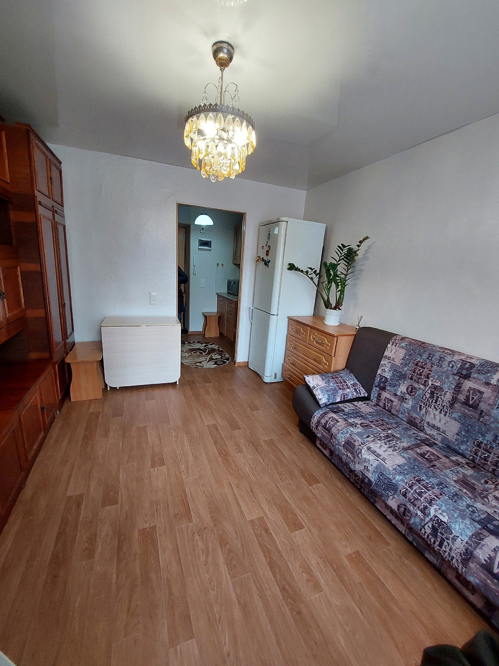 В квартире всё имеется для комфортного проживания: диван, места хранения, плита, холодильник, микроволновая печь, стиральная машина, чайник, утюг, стол, стулья, посуда.